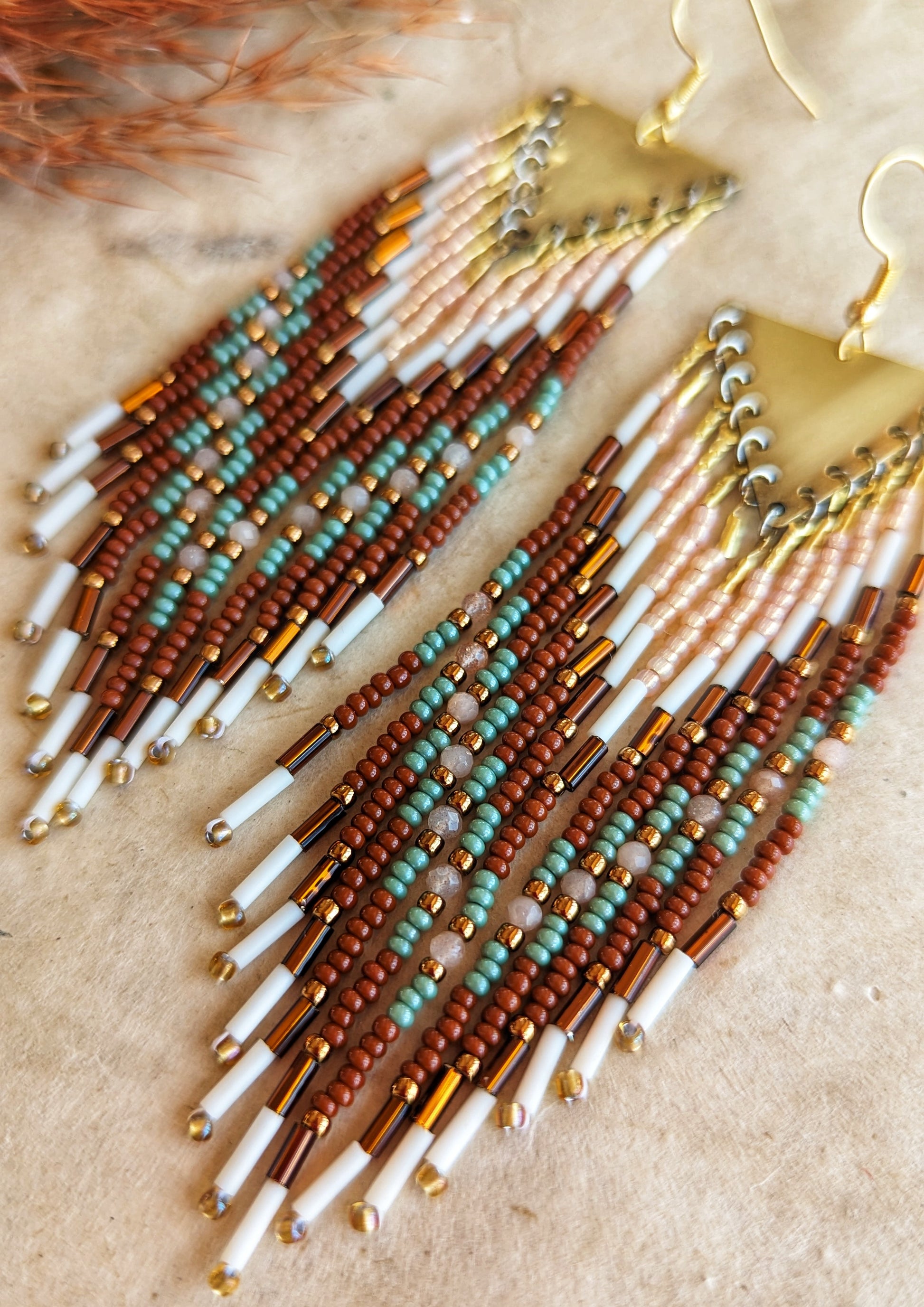 Introducing the gorgeous Dolores Peach Moonstone Seed Bead Earrings. These earrings feature a warm palette of terracotta, brown, and sage green. Adorned with faceted peach moonstones, these earrings exude a playful yet bohemian vibe. Meticulously handcrafted, each pair combines earthy tones with the shimmering allure of moonstones, capturing the essence of boho chic style. Their lightweight and versatile design makes them perfect for any occasion, adding a subtle touch of color to your outfit.