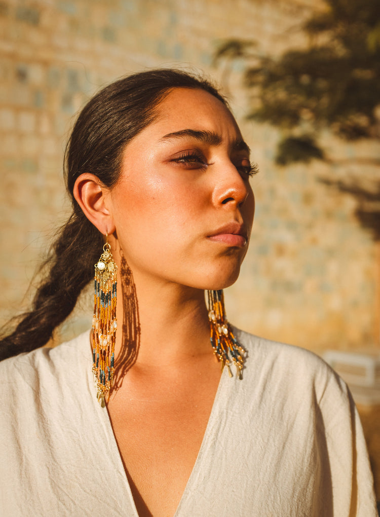 - Handmade boho beaded earrings created with glass beads, brass, and gold-filled ear wires.