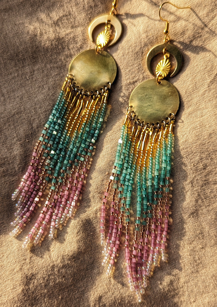 To preserve your Moon & Milk earrings, store them laying flat or hanging, preferably flat, in a dry and dark place. Original packaging is ideal for long-term storage. Keep away from heat, as the nylon thread used in construction may shrink and damage the beadwork.