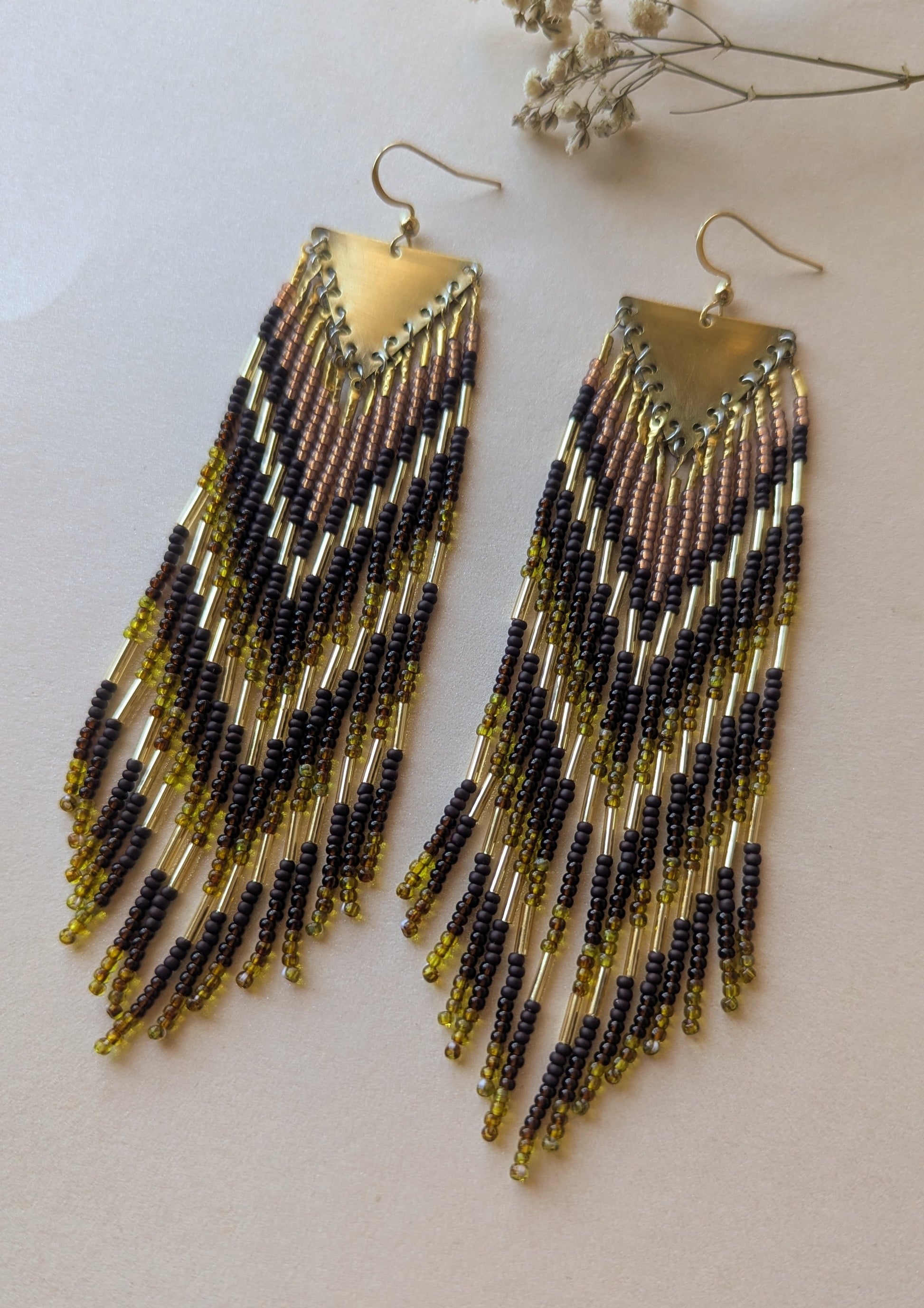 The long native earrings weave deep brown, amber, and warm gold in unique beadwork that feels rooted in earth and movement. Brass jewelry accents rise above the beaded fringe with steady warmth, giving the piece the presence of someone who stepped into danger for her people without hesitation.