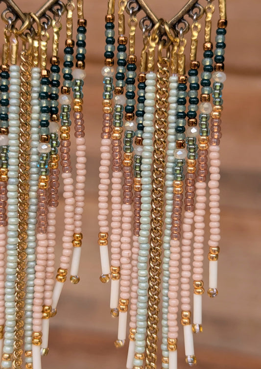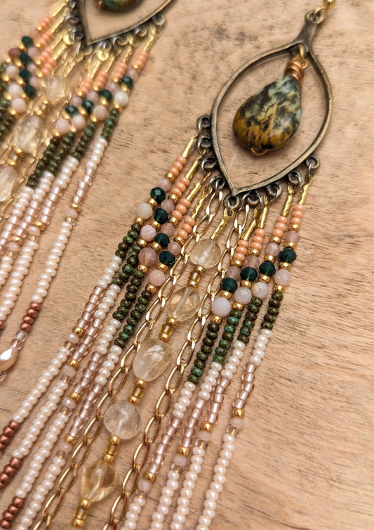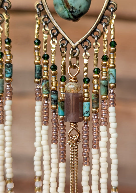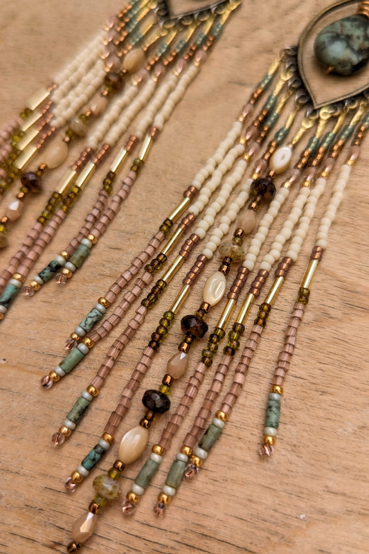 Long beaded earrings, handcrafted with gemstones, brass, fire-polished glass beads, and intricate beadwork, that honor the slow return to the self. Ithaka tells the story of the journey after the Phoenix Uprising. It speaks to who you are beneath the fear and the doubt. These pieces are the regalia of the modern warrior, those who walk the long road toward truth with valor and an unwavering heart.