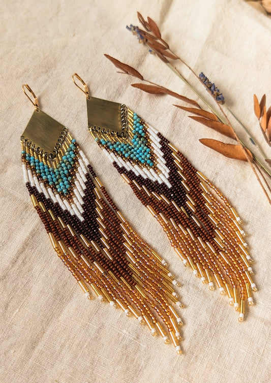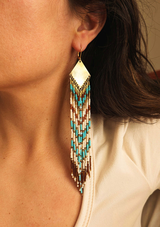 Inspired by the allure of the American Southwest, the Southwest Dreams Collection is composed of handmade seed bead earrings that are meticulously crafted to capture the essence of its vibrant sunsets and rich indigenous cultural heritage. Each pair is a unique work of art, combining modern craftsmanship with traditional design to bring a touch of the Southwest's incomparable beauty and mystique to your style. Lose yourself in the warmth and colors of the Southwest with these stunning earrings that are as timeless as the desert itself.