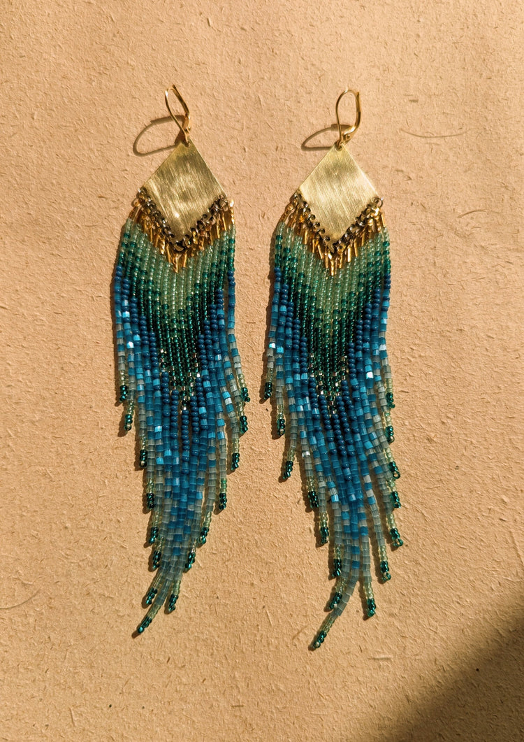 - Handmade boho beaded earrings created with glass beads, brass, and gold-filled leverbacks.