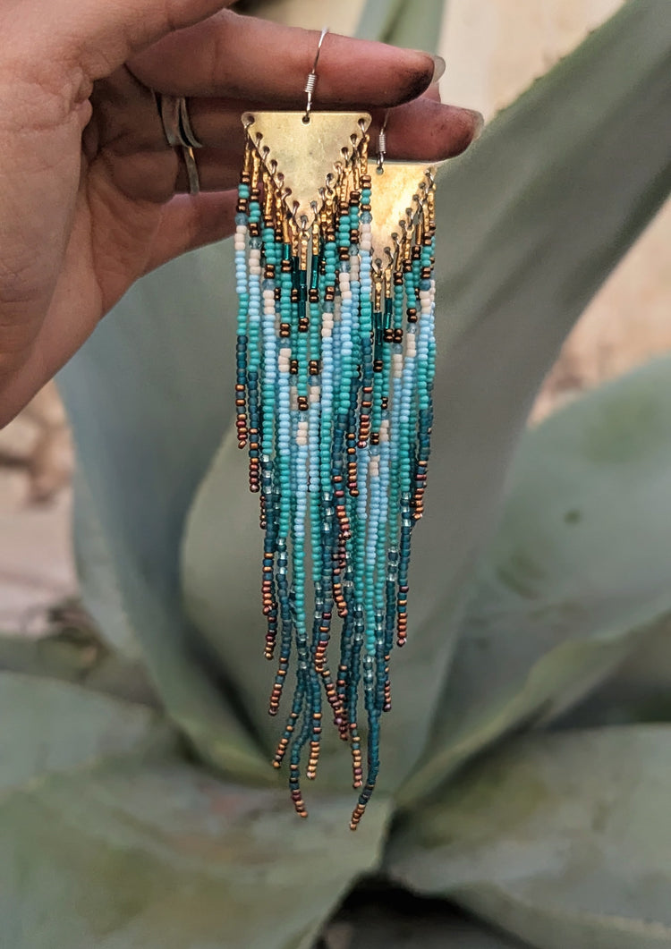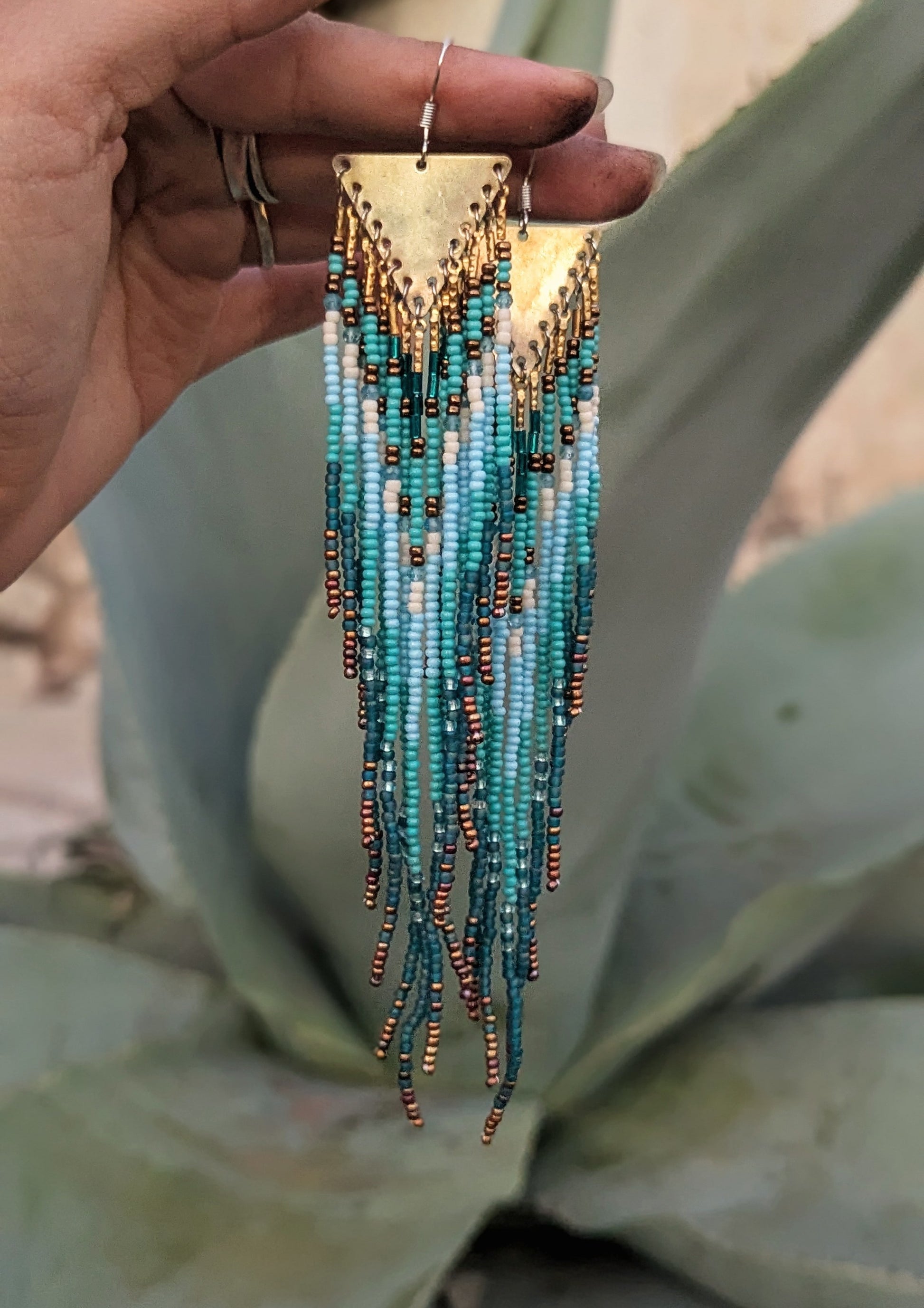 Azul Mezcalero Beaded Earrings brings together the colors of agave and sun-heated metal. Strands of turquoise and blue move with the ease of water over stone, catching light with every sensual motion. The brass plate warms against the skin, firm and bright, like mezcal smooth on the tongue.