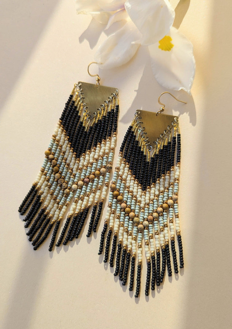 These handcrafted beaded fringe earrings by Moon & Milk bring together black, cream, and soft green beads woven into a rhythmic pattern that moves freely with the body.
