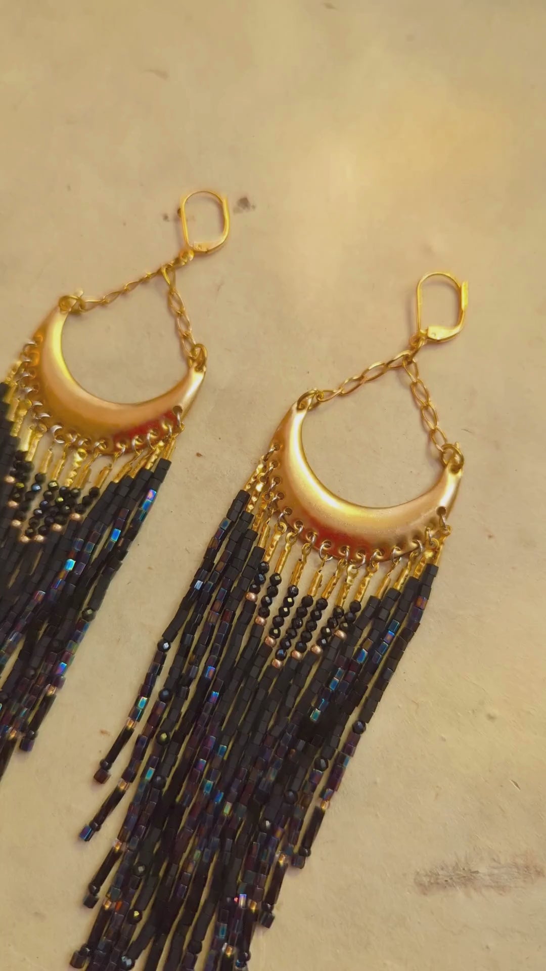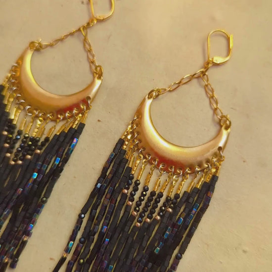 Channel your inner goddess with these dramatic crescent moon fringe earrings! Featuring sleek black beads cascading from a bold brass crescent, these earrings are the perfect balance of artisanal craftsmanship and elegance.
