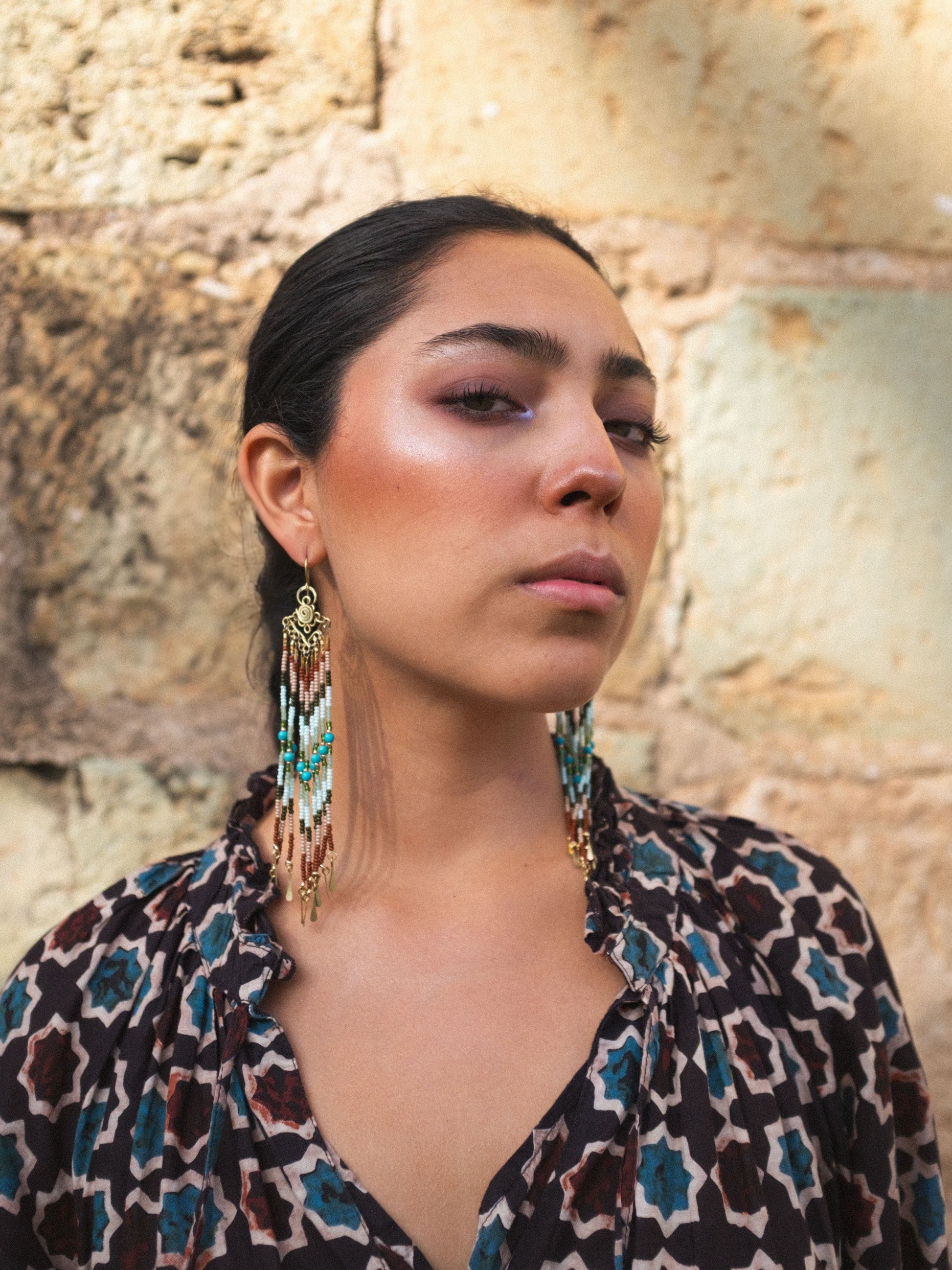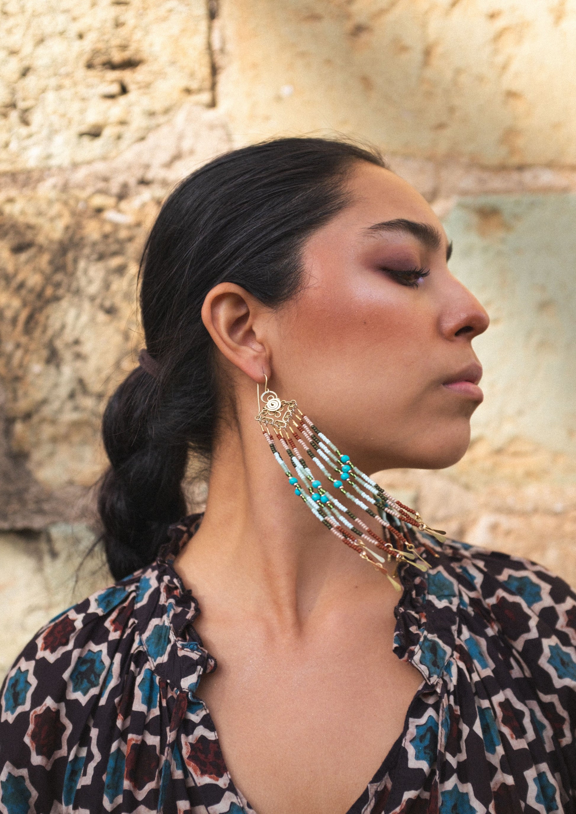 Suspiros de Turquesa isn’t made for women who follow trends. It's made for those who understand the rhythm of their own fire — wild and relentless. Handcrafted in earth and sky tones, these artisanal earrings don’t ask for attention; they command it.