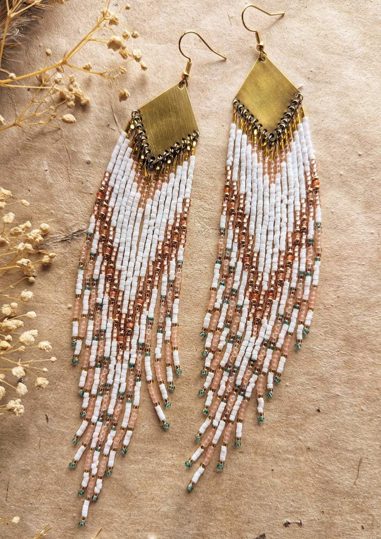 To preserve your Moon & Milk earrings, store them laying flat or hanging, preferably flat, in a dry and dark place. Original packaging is ideal for long-term storage. Keep away from heat, as the nylon thread used in construction may shrink and damage the beadwork.