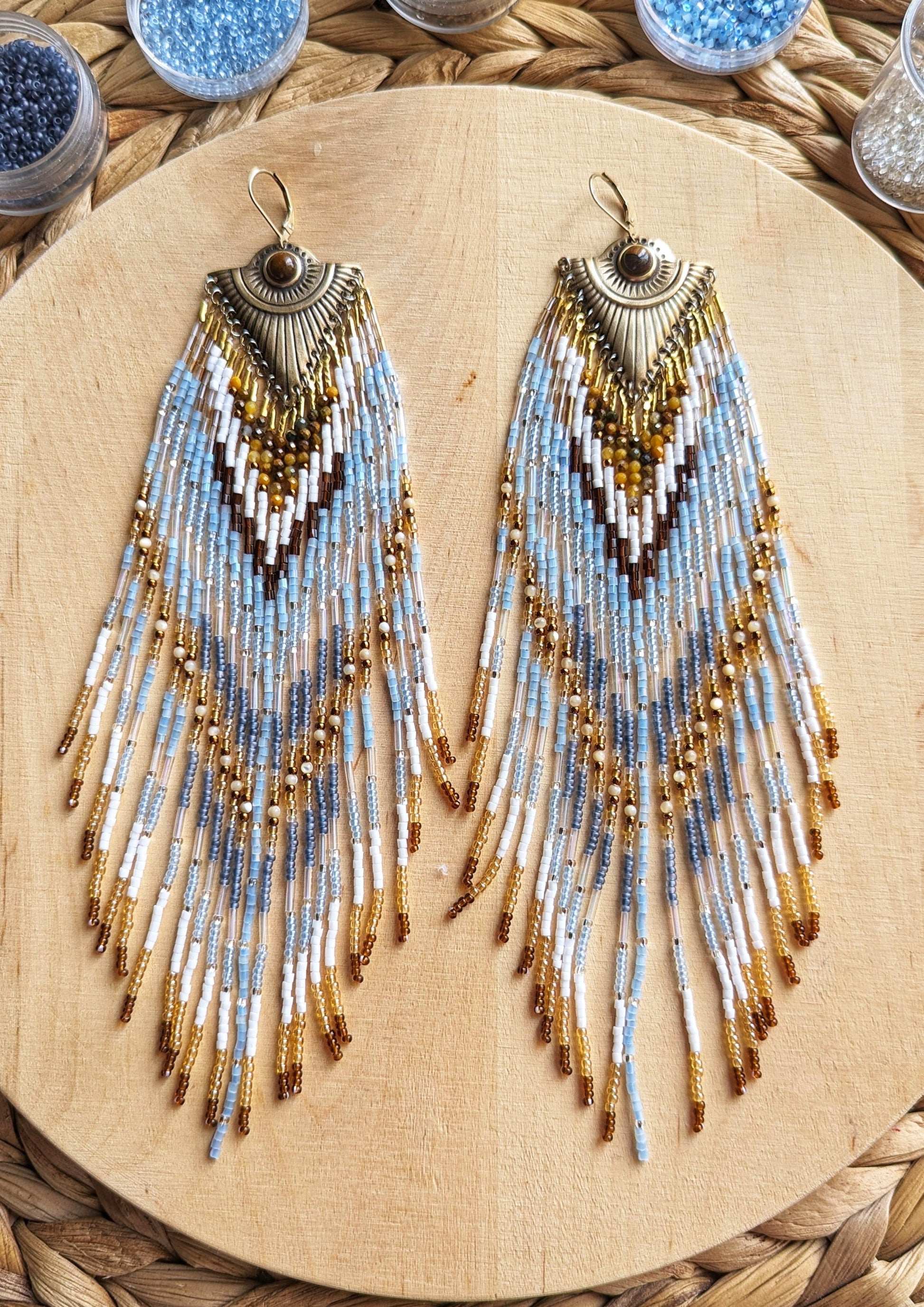 - Handmade seed bead earrings created with glass beads, brass, natural stones, and Japanese nylon thread for ultimate durability.