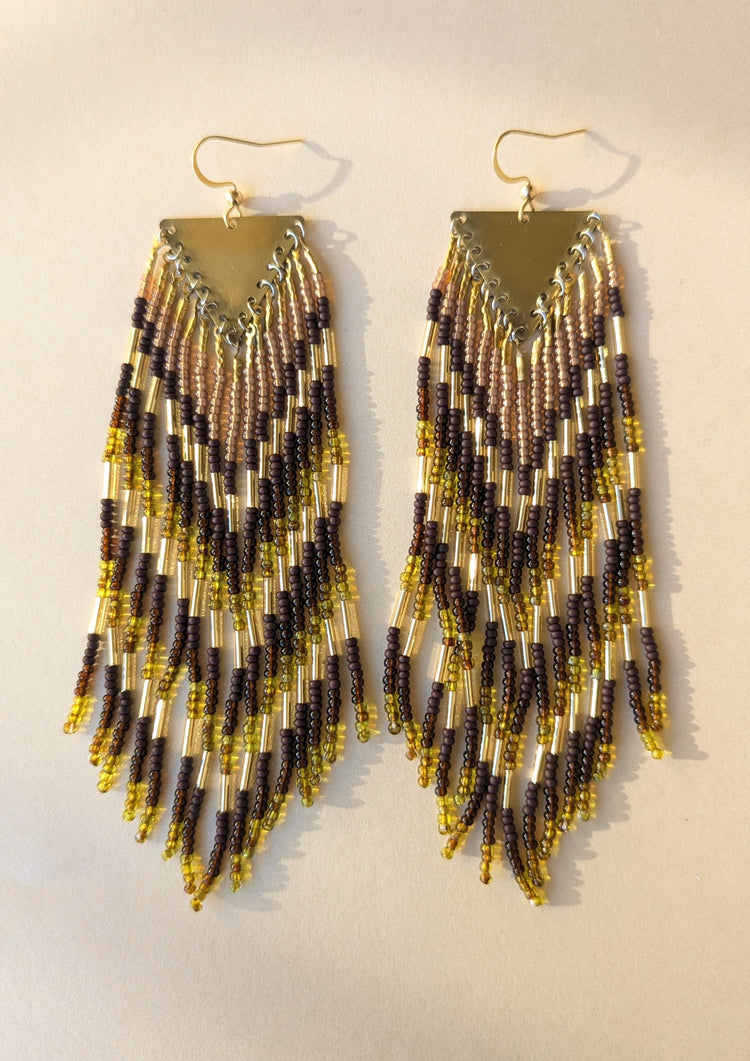 The long native earrings weave deep brown, amber, and warm gold in unique beadwork that feels rooted in earth and movement. Brass jewelry accents rise above the beaded fringe with steady warmth, giving the piece the presence of someone who stepped into danger for her people without hesitation.