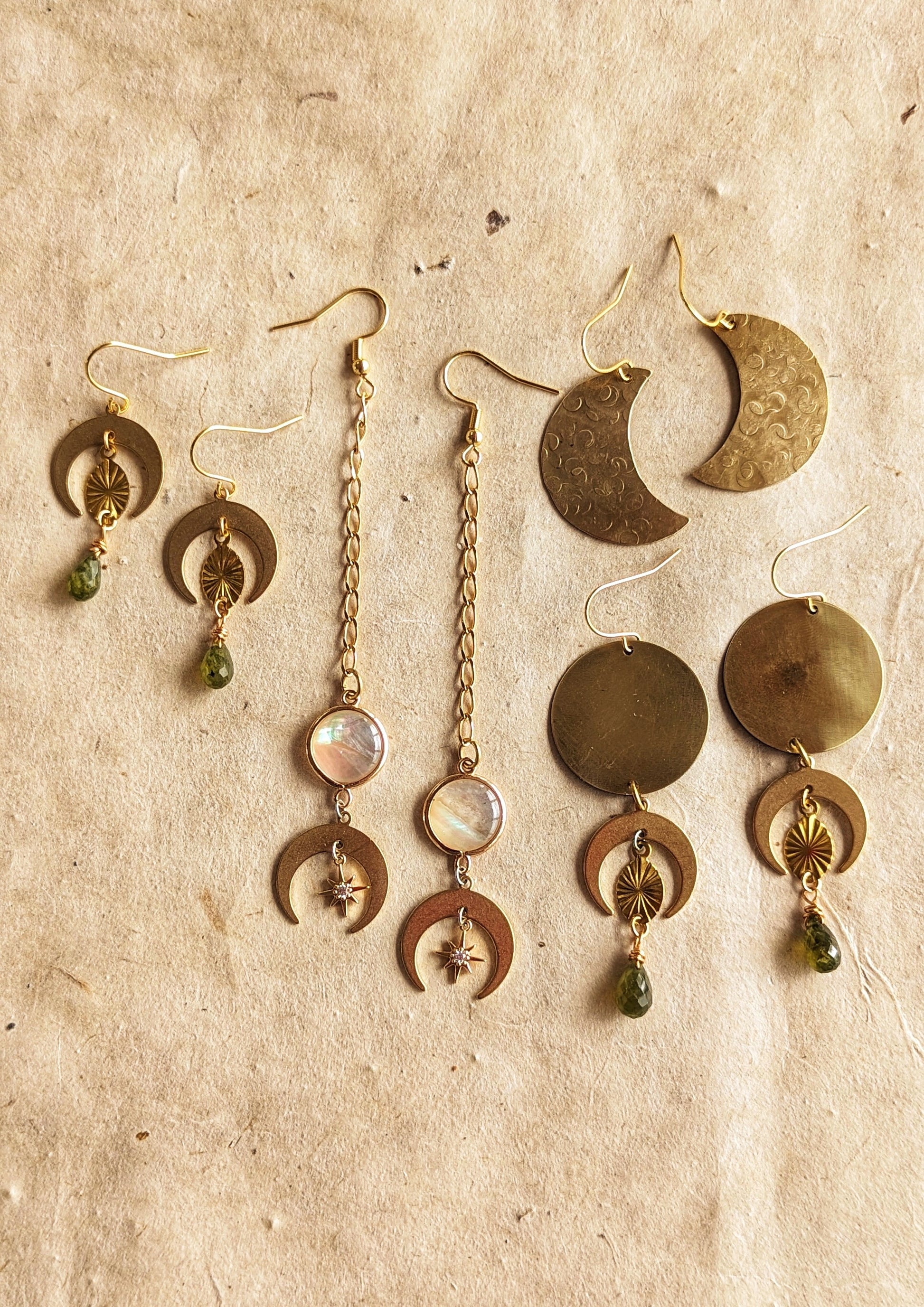 - Handmade crescent moon earrings with gold sun charms and wire-wrapped faceted teardrops.