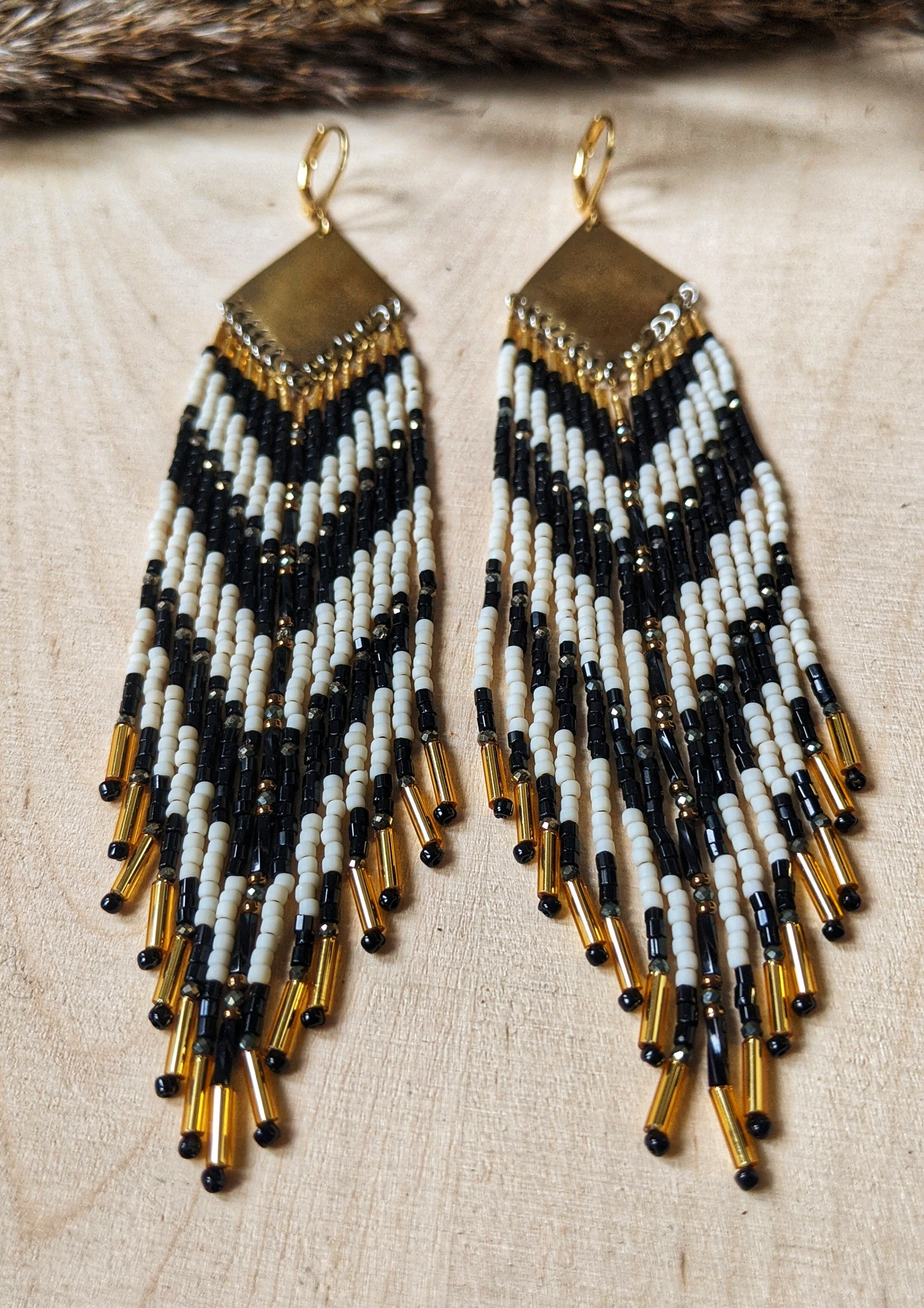 Classic, bold, and endlessly versatile, the bell Black & White beaded fringe earrings bring an elegant edge to your collection. Handcrafted with precision, each strand alternates between sleek black and creamy white beads, forming a striking chevron pattern that exudes boho chicness.