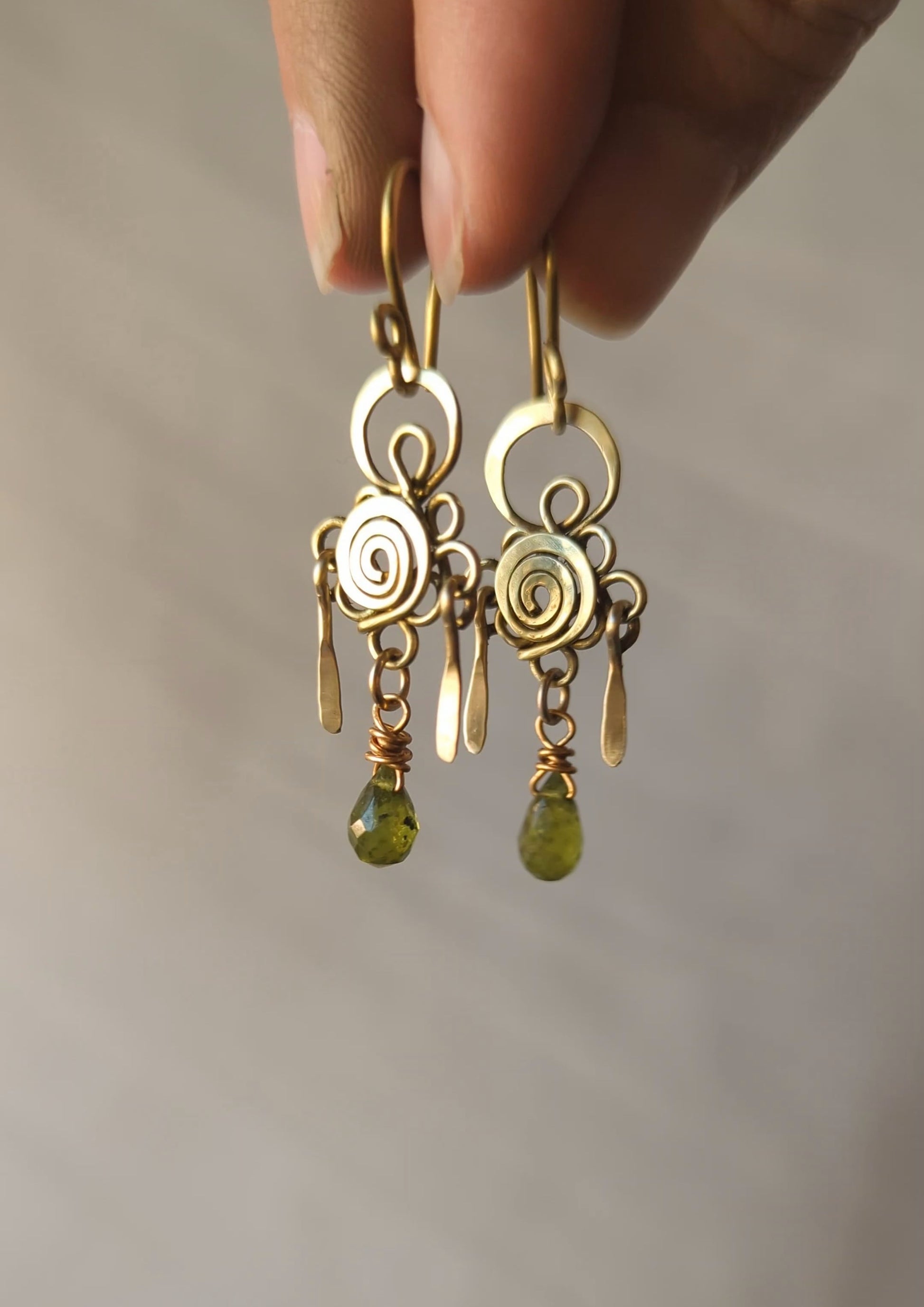 Besitos del Sol Brass Earrings catch the heat of sunrise in brass and green garnet. The spirals trace the sun’s motion, the metal warm to the touch, the stones alive with intense fire. Each movement glints with gold and shadow, a soft shimmer that feels both artisanal and intimate.