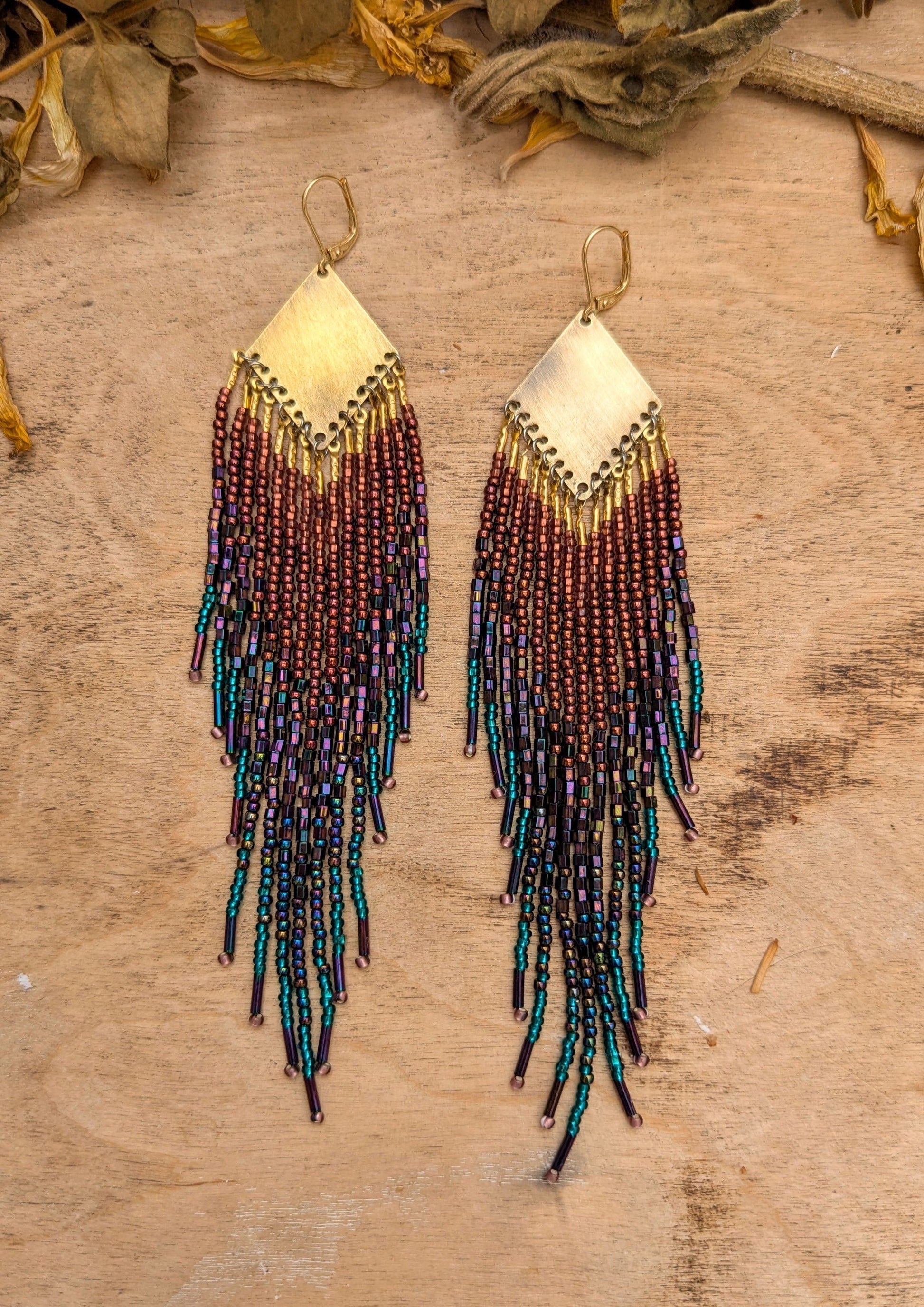 - Handmade seed bead earrings created with brass, glass beads, and Japanese nylon thread.