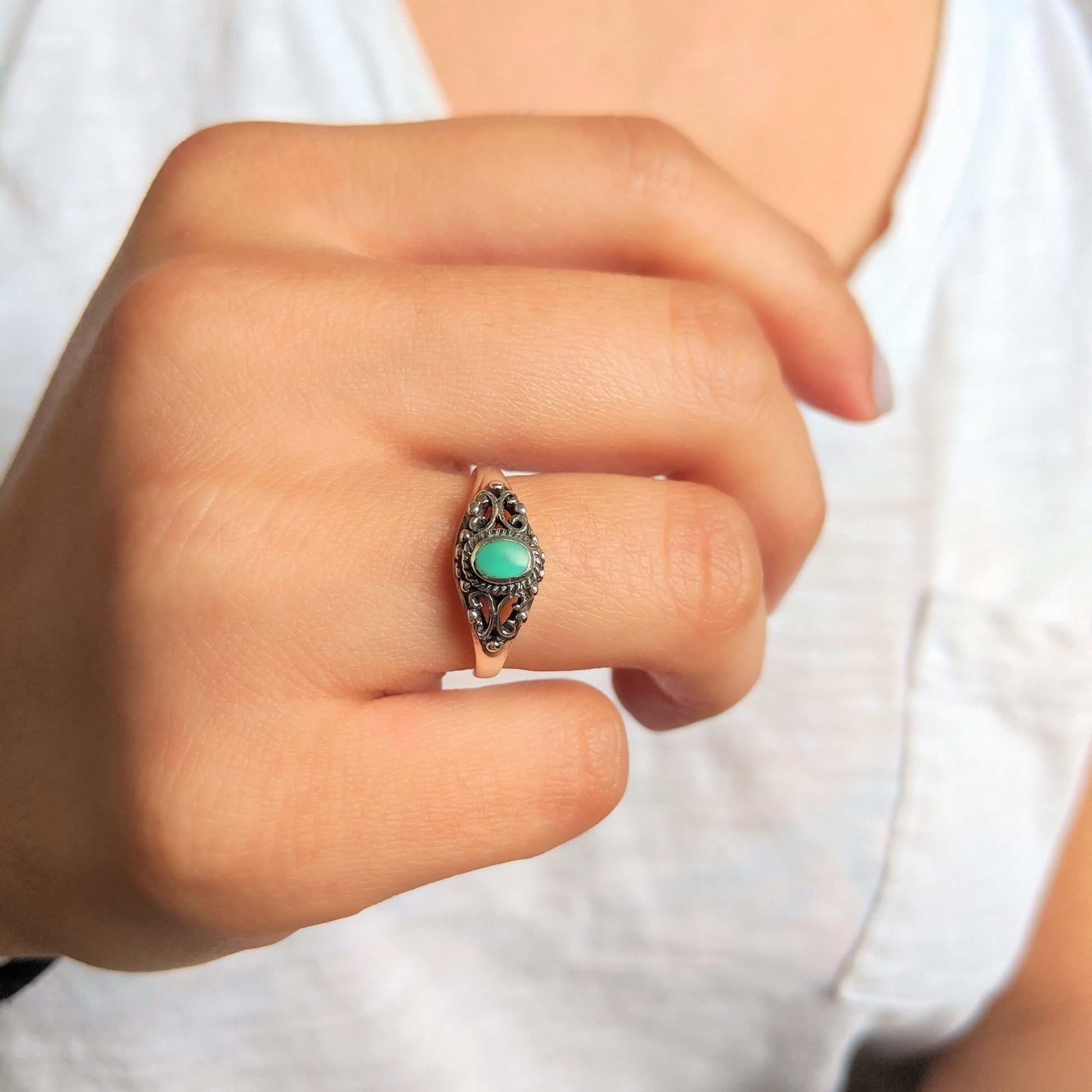 - 925 sterling silver ring with a small turquoise stone and filigree vine design