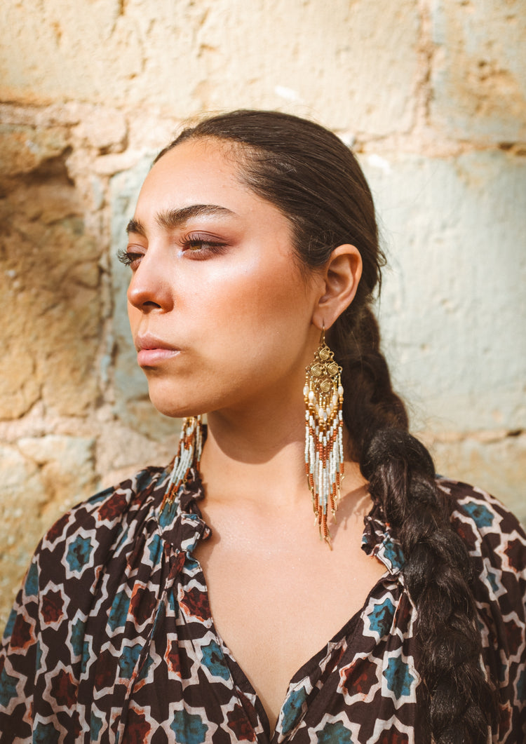 There is wisdom in the spiral, the ancient symbol of life unfolding. The Caracoles de Barro Beaded Earrings were inspired by the Oaxacan soil. Each brass spiral represents a journey inward and back again, while the mother-of-pearl and clay-red sandstone beads tell the story when water meets el barro.