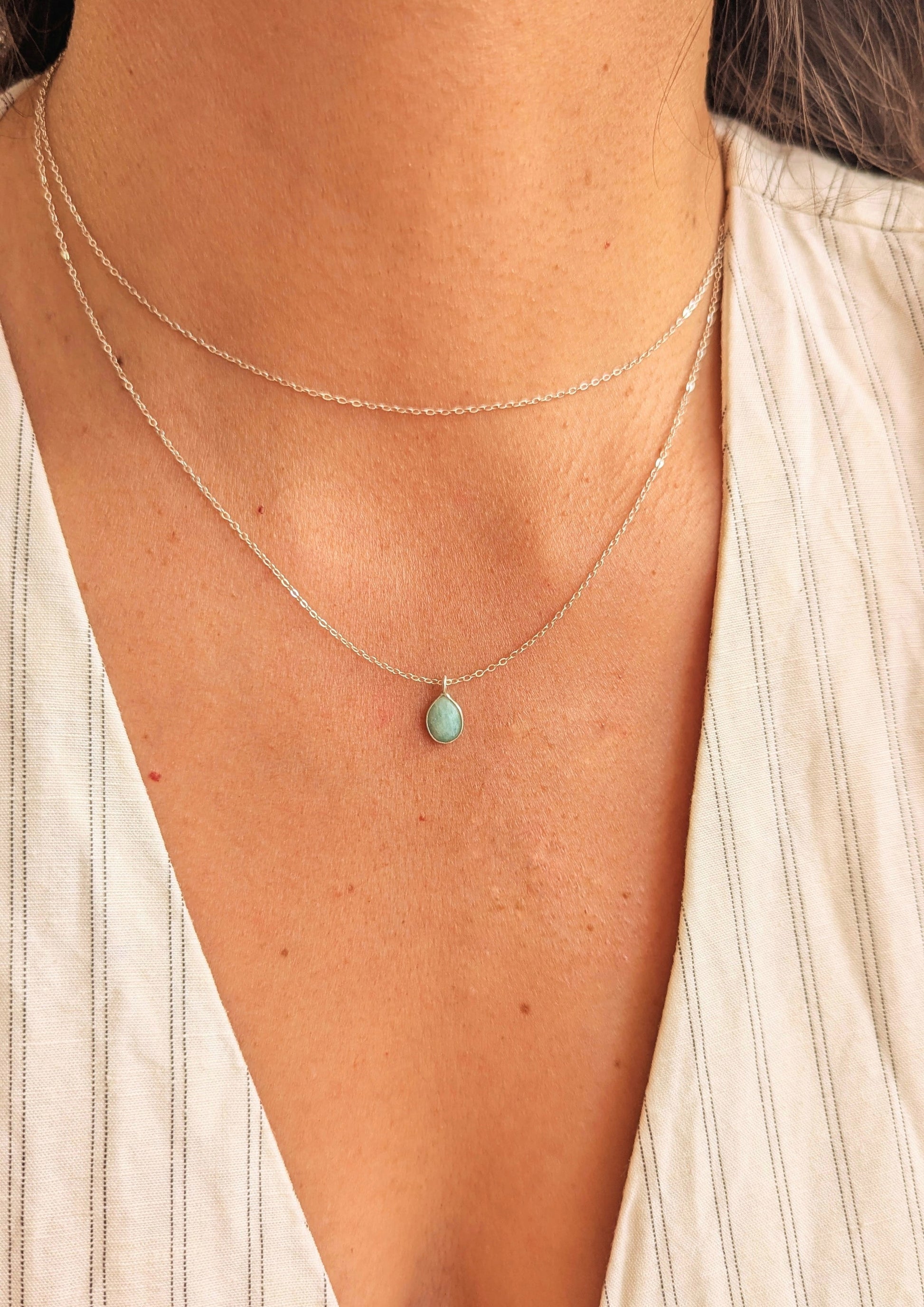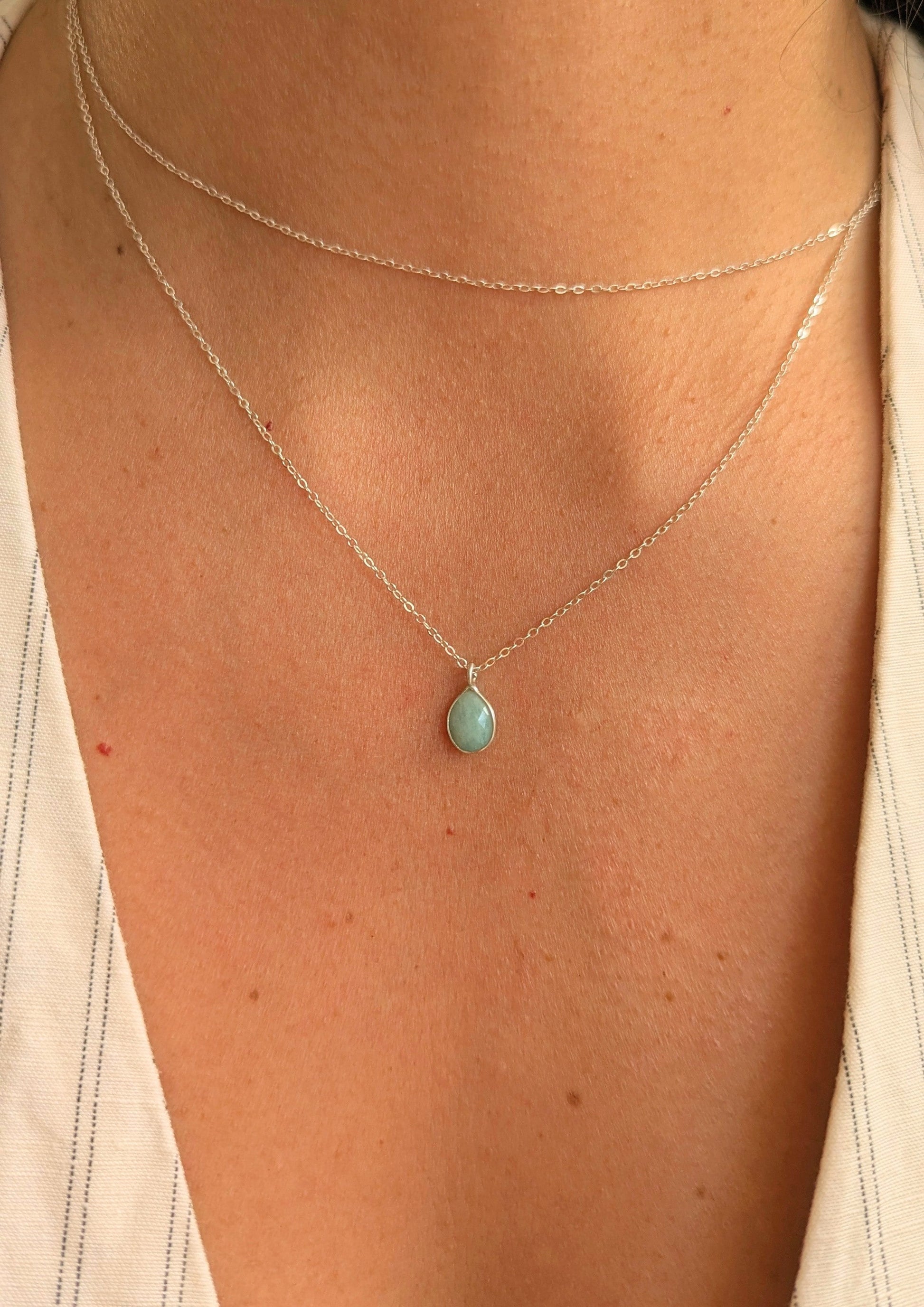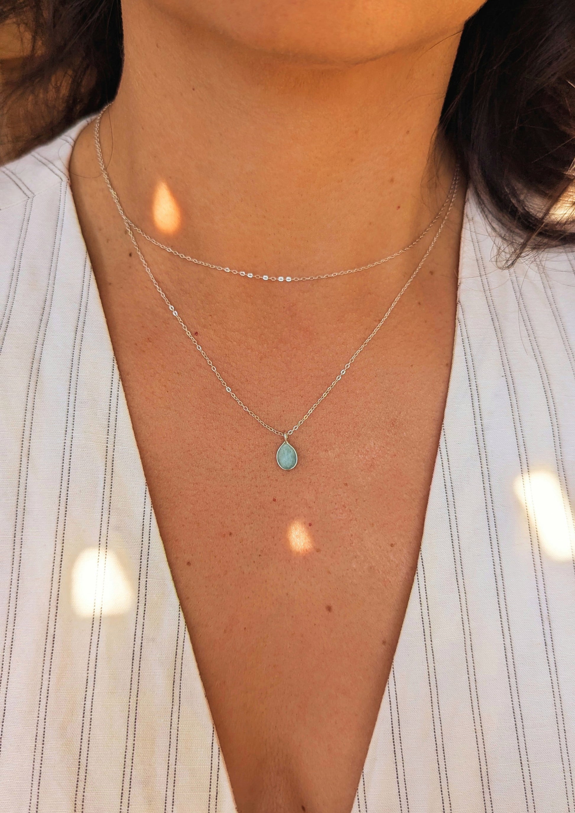 Sterling silver layer necklace with a tiny aqua amazonite pedant.