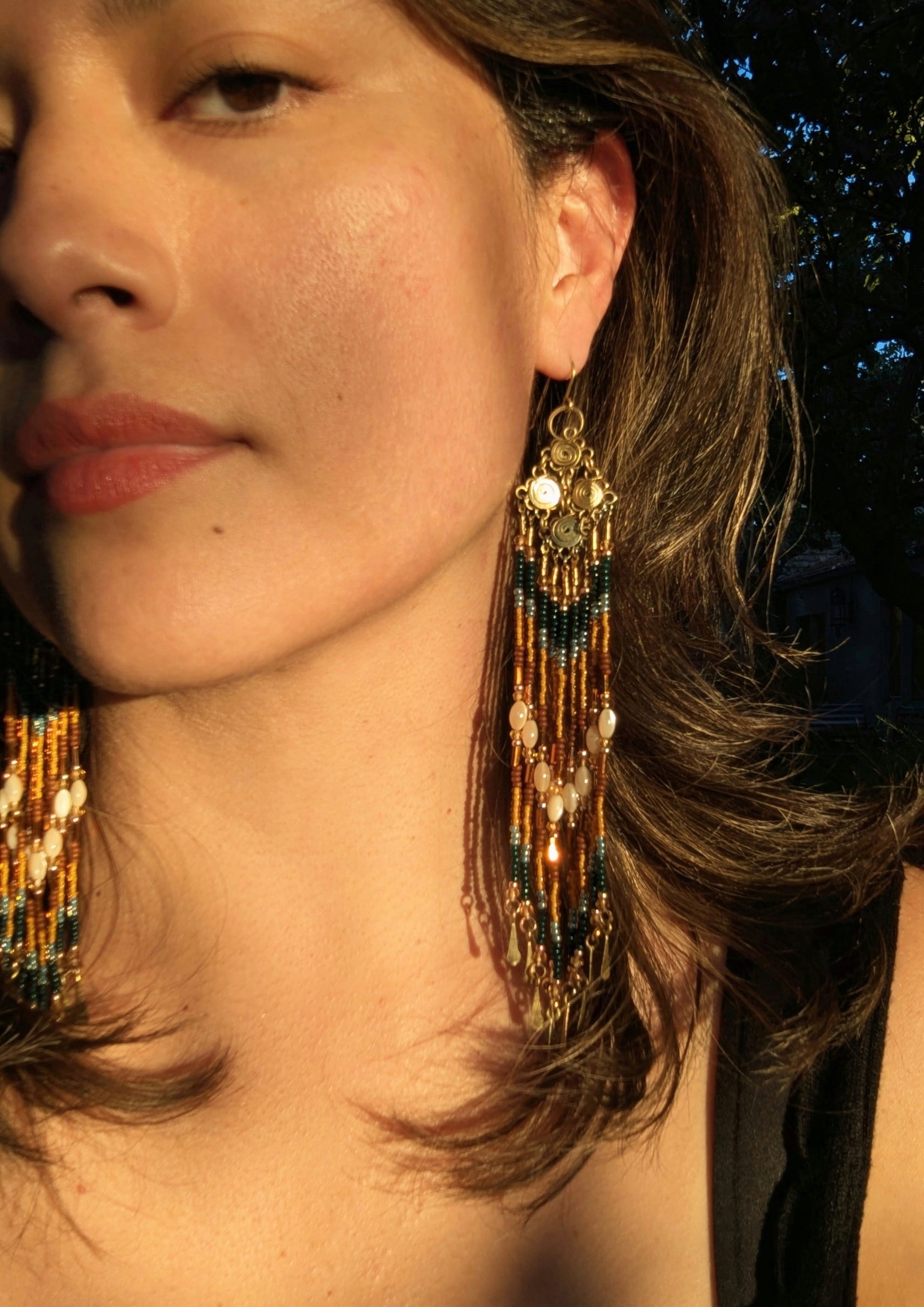 To preserve your Moon & Milk earrings, store them laying flat or hanging, preferably flat, in a dry and dark place. Original packaging is ideal for long-term storage. Keep away from heat, as the nylon thread used in construction may shrink and damage the beadwork.