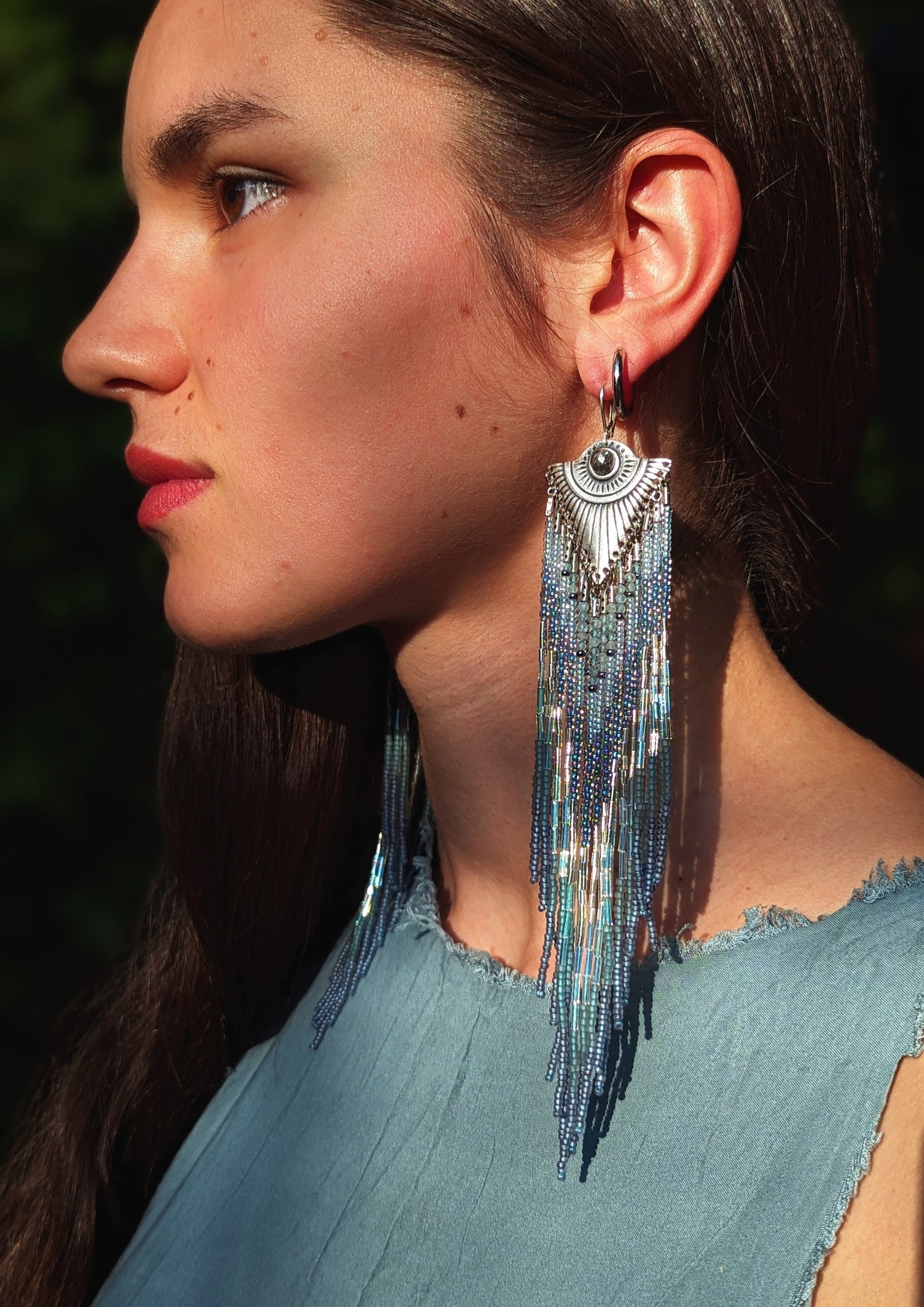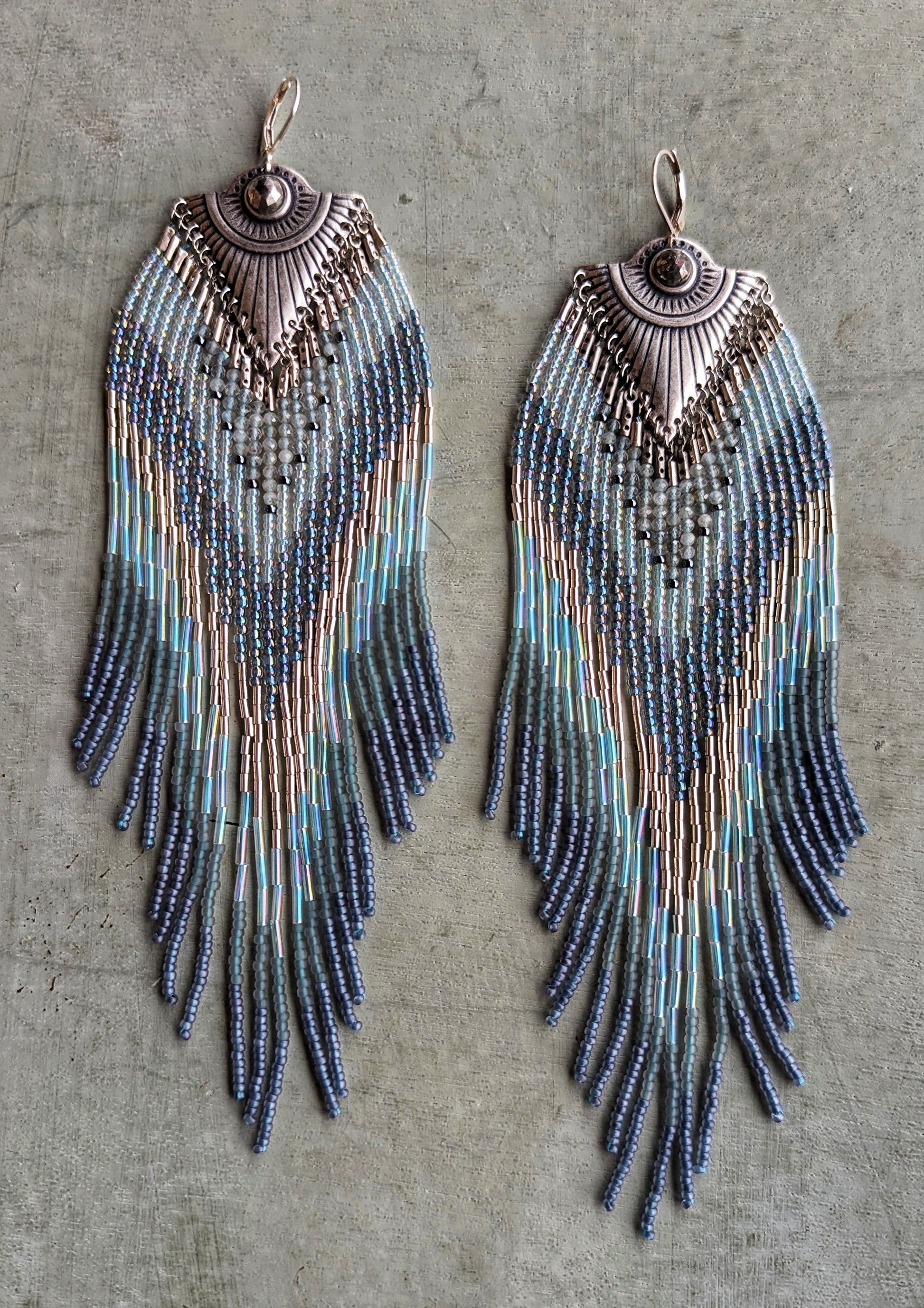 - Artistic handcrafted seed bead earrings created with semi-precious stones, glass beads, and brass.