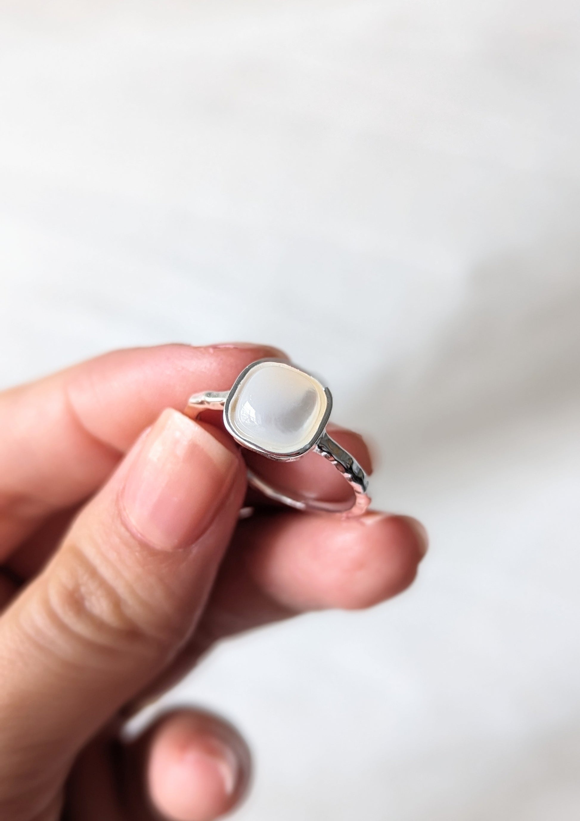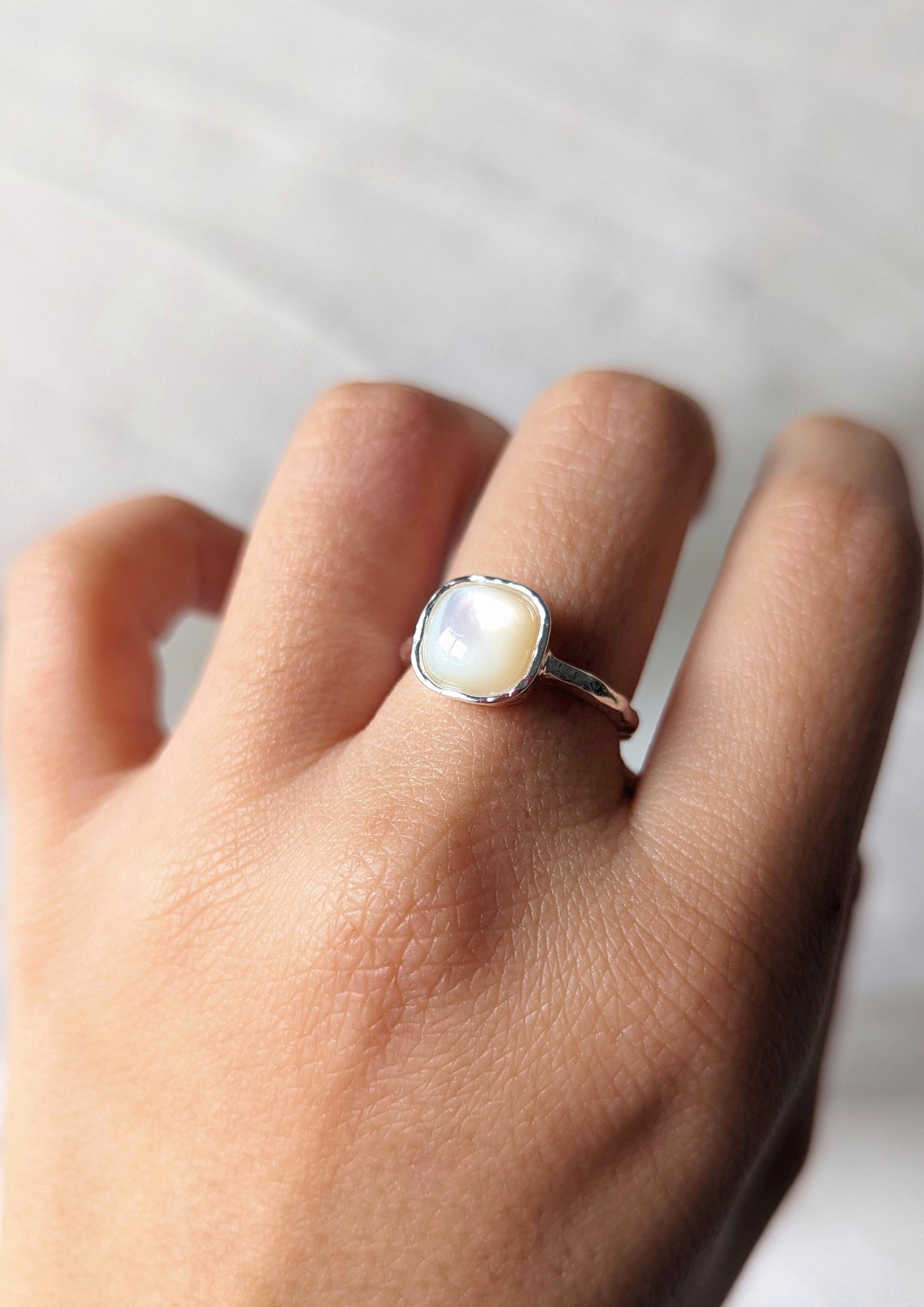 - 925 sterling silver hammered band ring with a iridescent mother of pearl stone