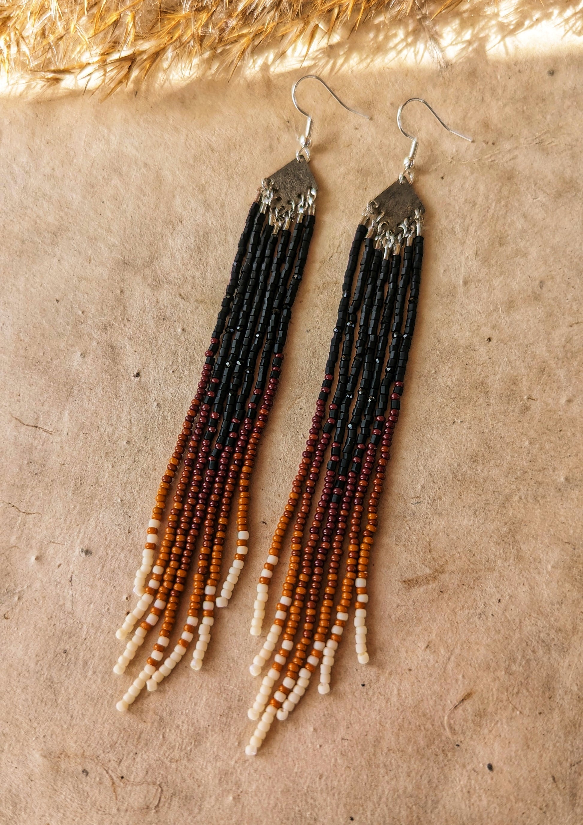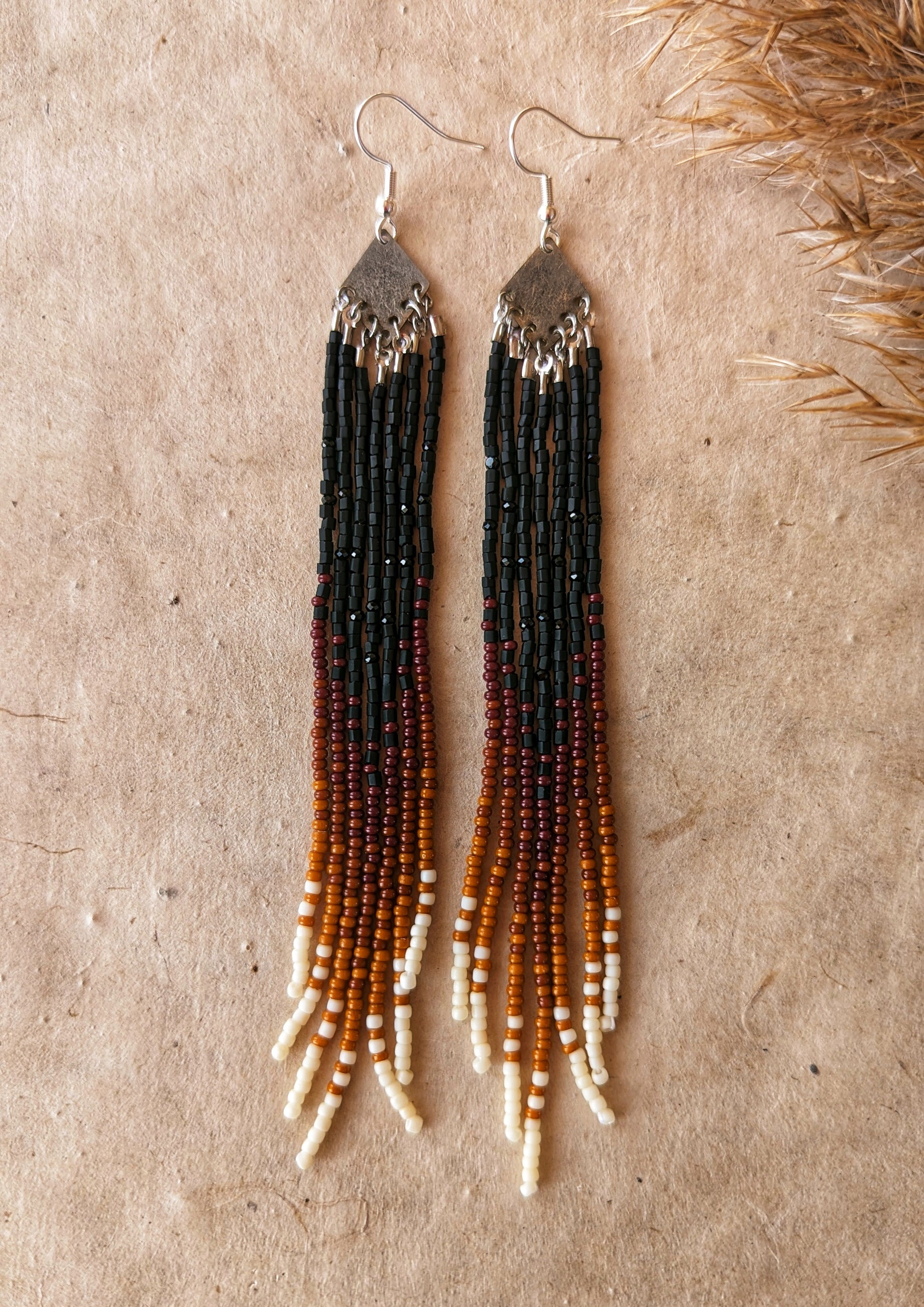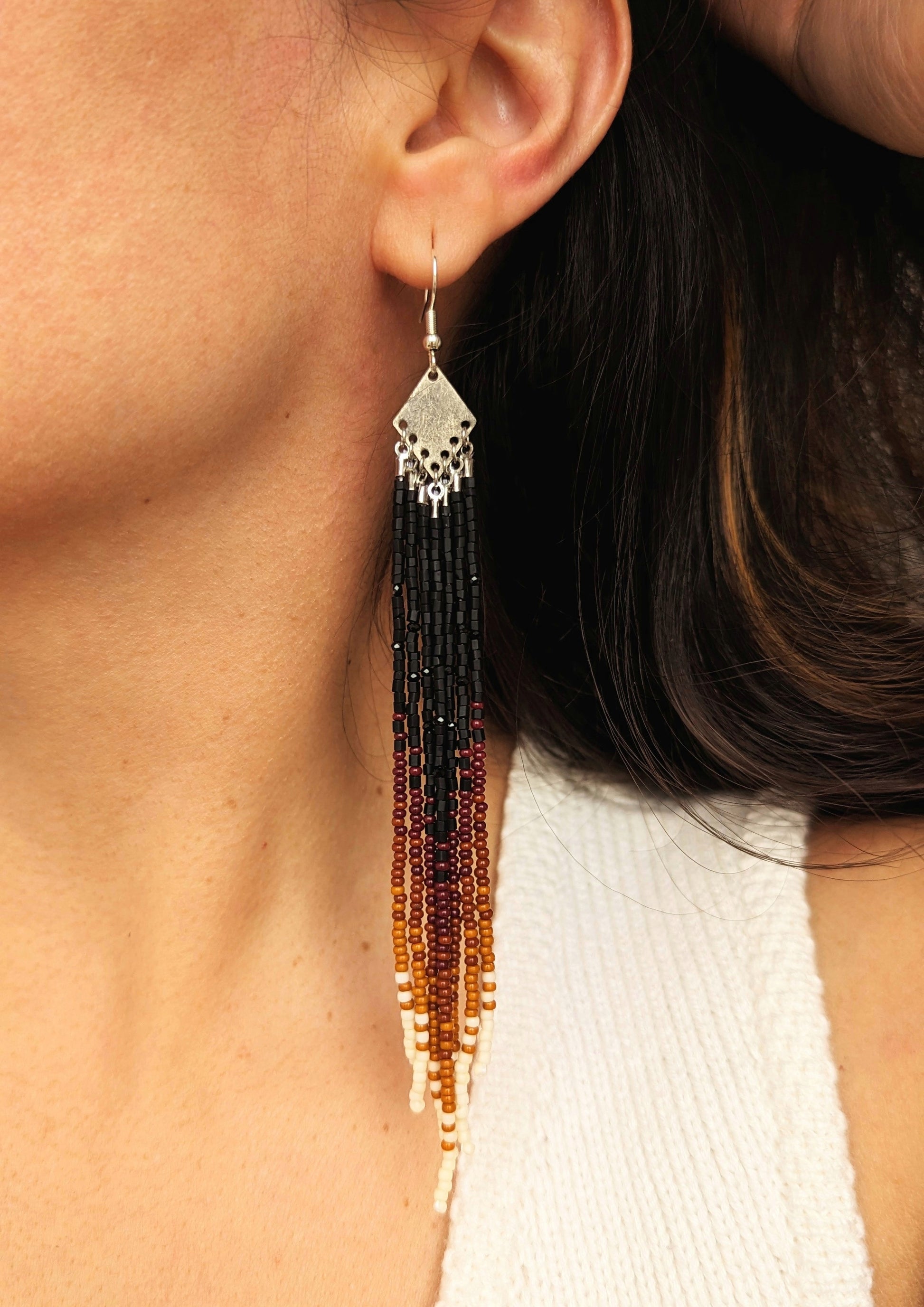 Inspired by the deep hues of autumn forests, these beaded fringe earrings showcase a mesmerizing gradient from rich black to warm earth tones. The intricate beadwork flows seamlessly, capturing the essence of twilight descending over a forest. Suspended from a silver-plated diamond base, each strand of beads echoes the serene yet mysterious charm of the woods. These earrings evoke the sultry elegance of nature, perfect for those who appreciate the beauty of organic transitions and the subtle power of natural colors.