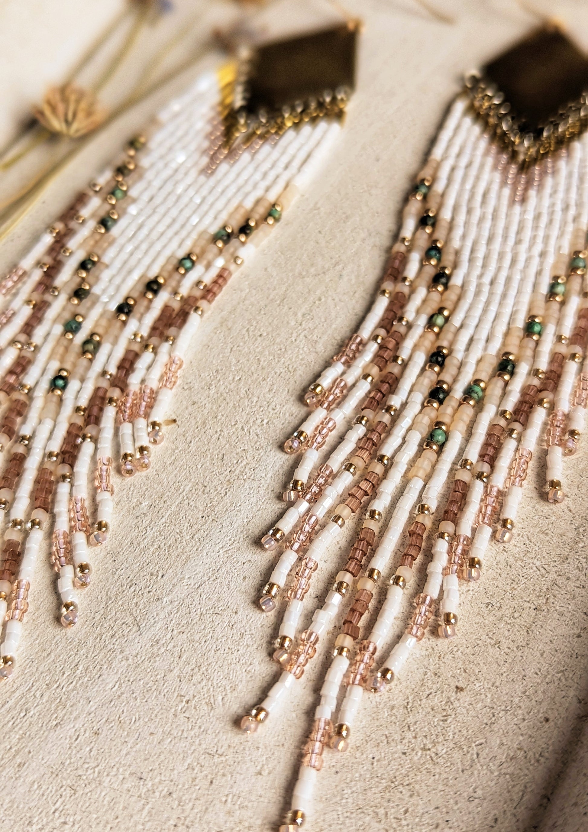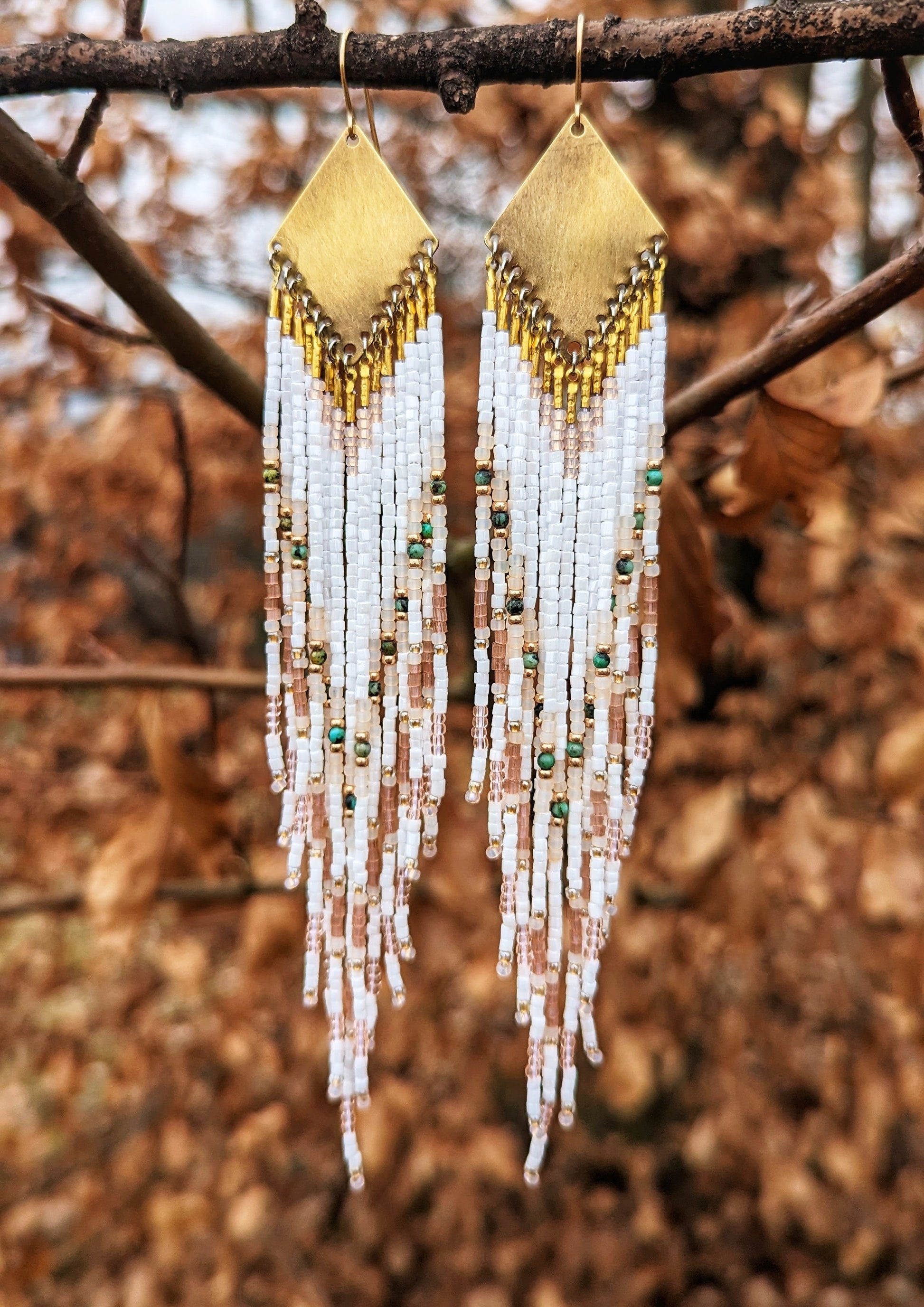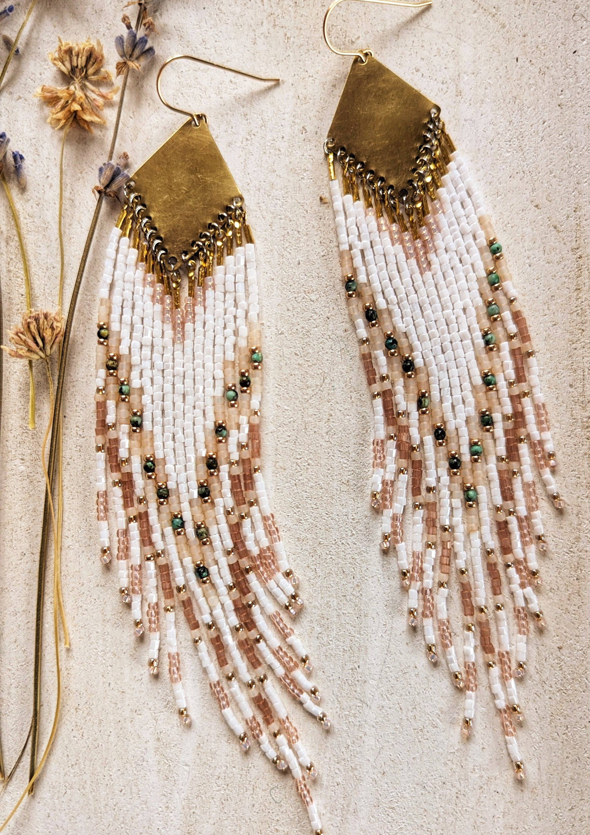 - Handmade seed bead earrings created with antique-finish brass, African turquoise, glass beads, gold-filled ear wires, and high-quality Japanese nylon thread for ultimate durability.