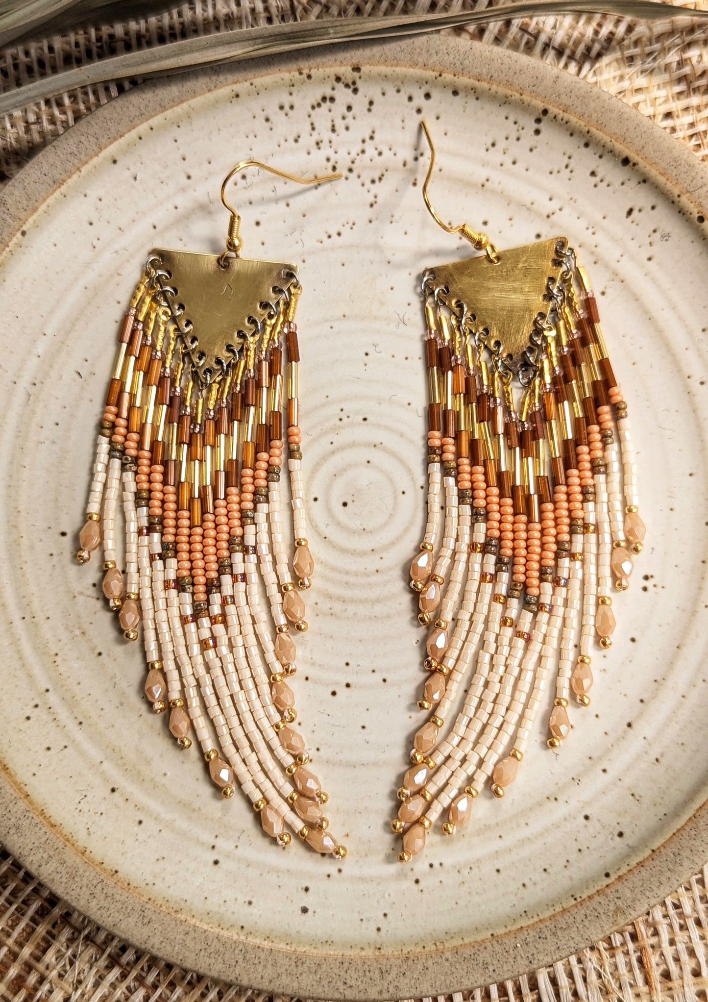 Meet the Gigi Cream Beaded Earrings, a tribute to the Hong Kongese activist’s bold spirit! Handcrafted with Czech hex-cut beads, Chinese oval drops, and gold bugles, they create a cascading fringe that moves with you. The earthy peach and cream tones pair beautifully with a brass accent, all finished with 18k gold-plated surgical steel ear wires—perfect for sensitive ears.