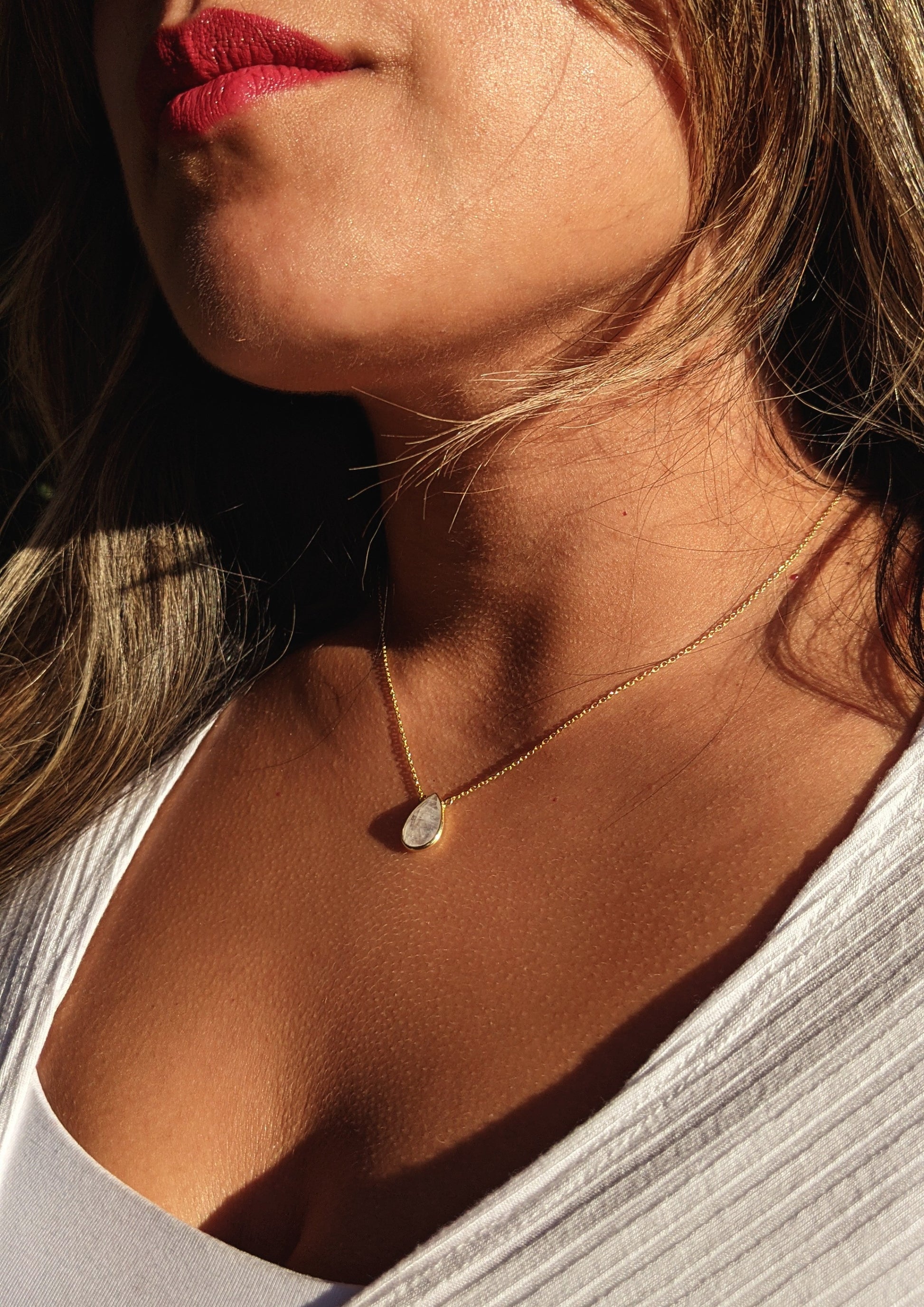 - 14K gold plated chain necklace with a teardrop faceted rainbow moonstone pendant.