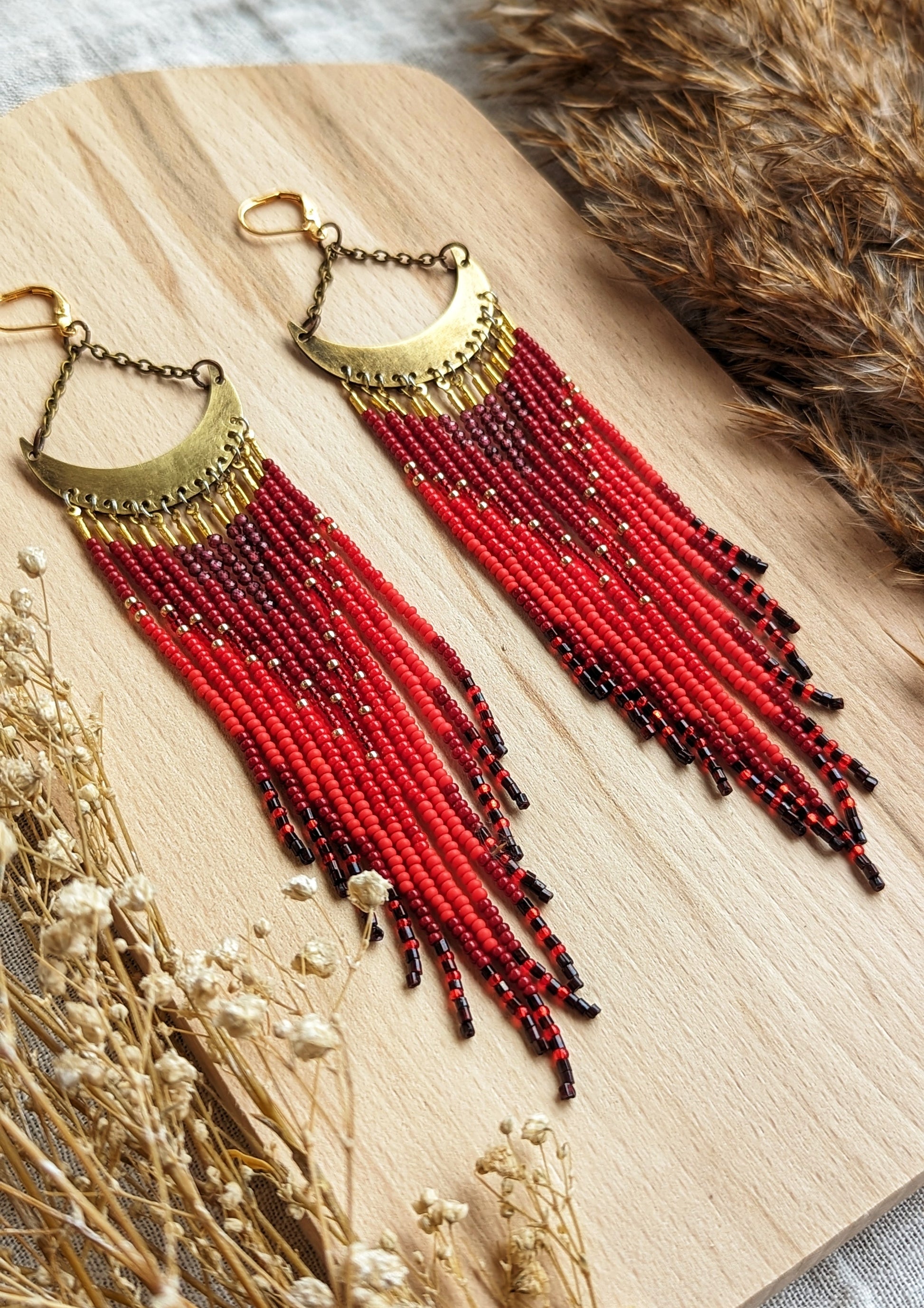 The red seed beads and garnet stones symbolize energy and passion, while the moon charm adds a touch of femininity and grace, resulting in a stunning accessory that radiates confidence.