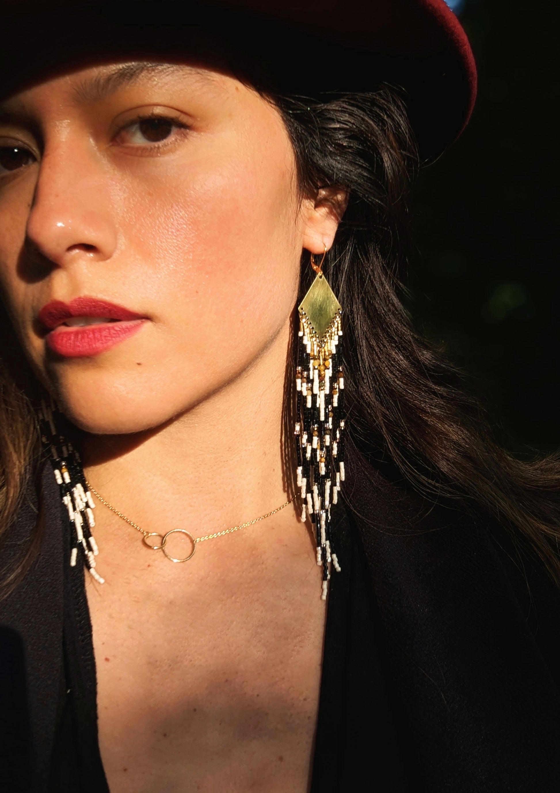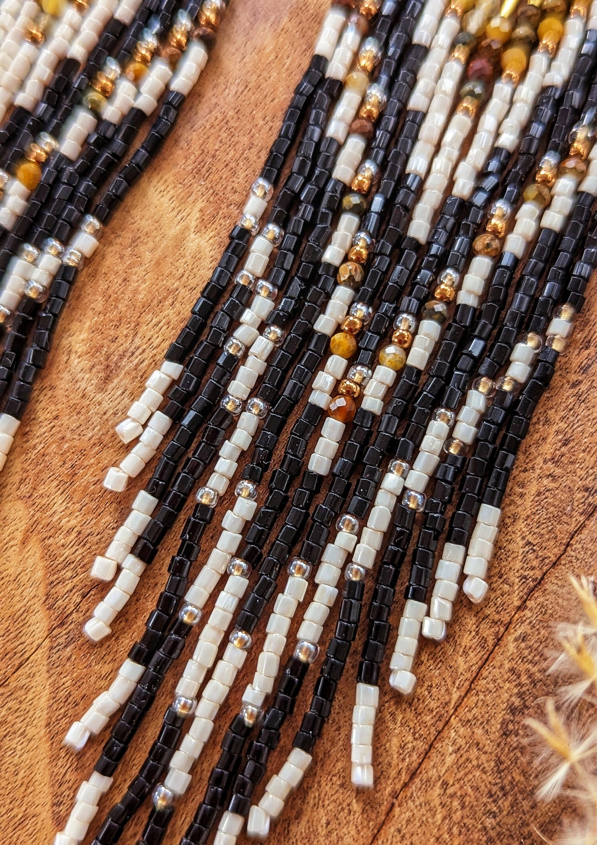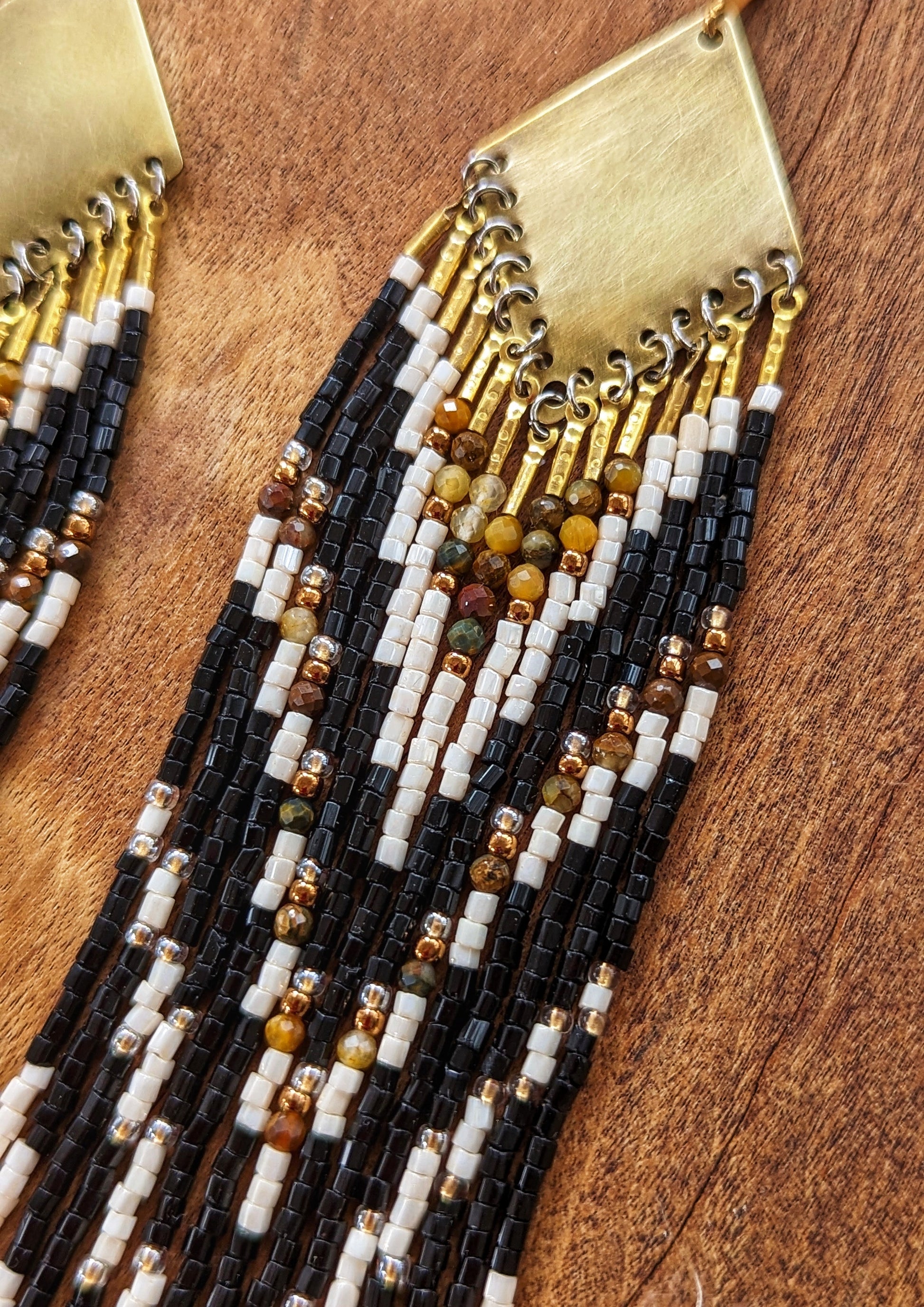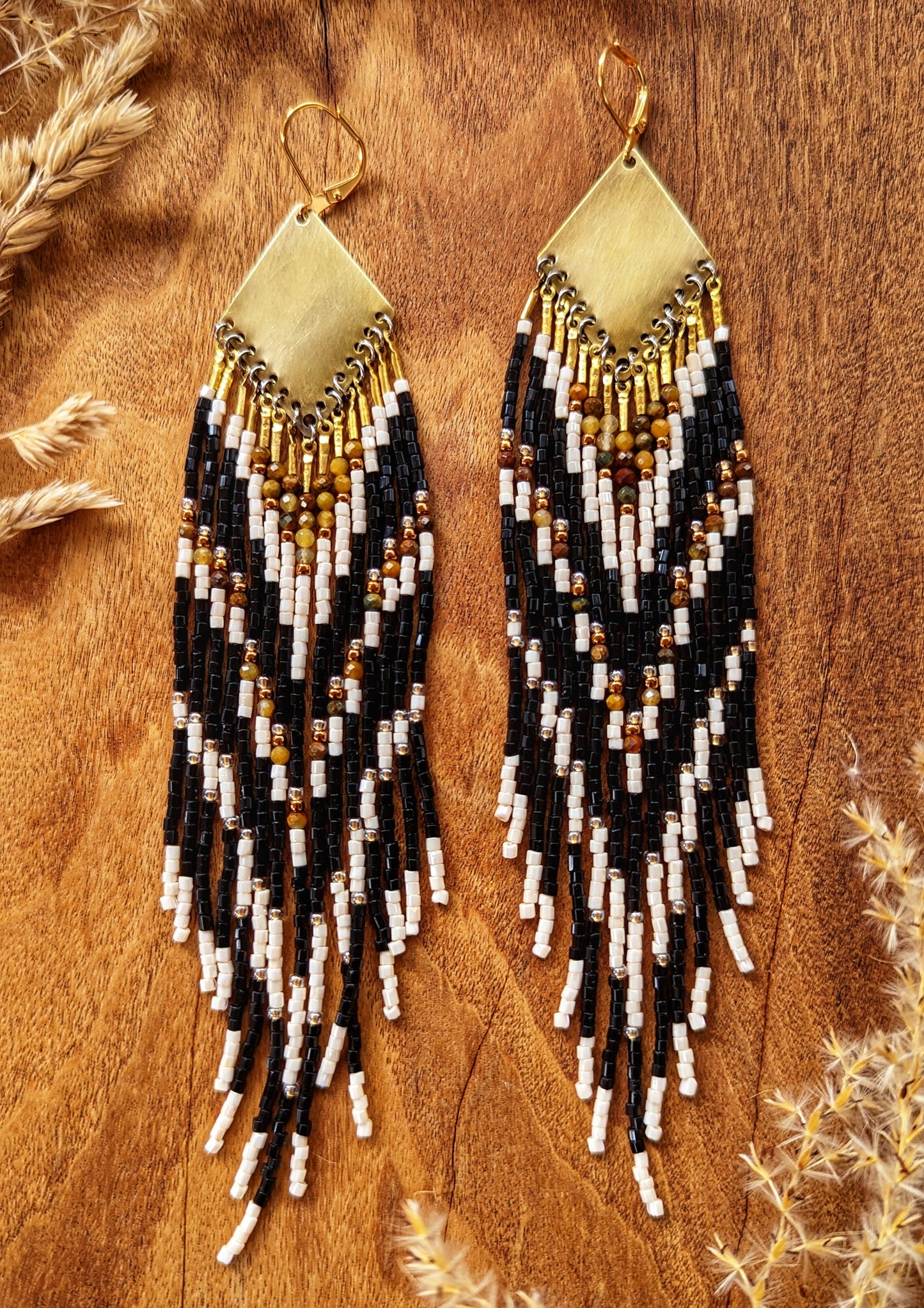 Black and ivory beads cut with amber and gold, flowing from brass like flames breaking through the night, these artisan earrings are like no other. Handcrafted as wearable art, weaving unique beadwork, brass jewelry, and long native earrings into a design that speaks of strength, resilience, and the beauty of rising from the dark.