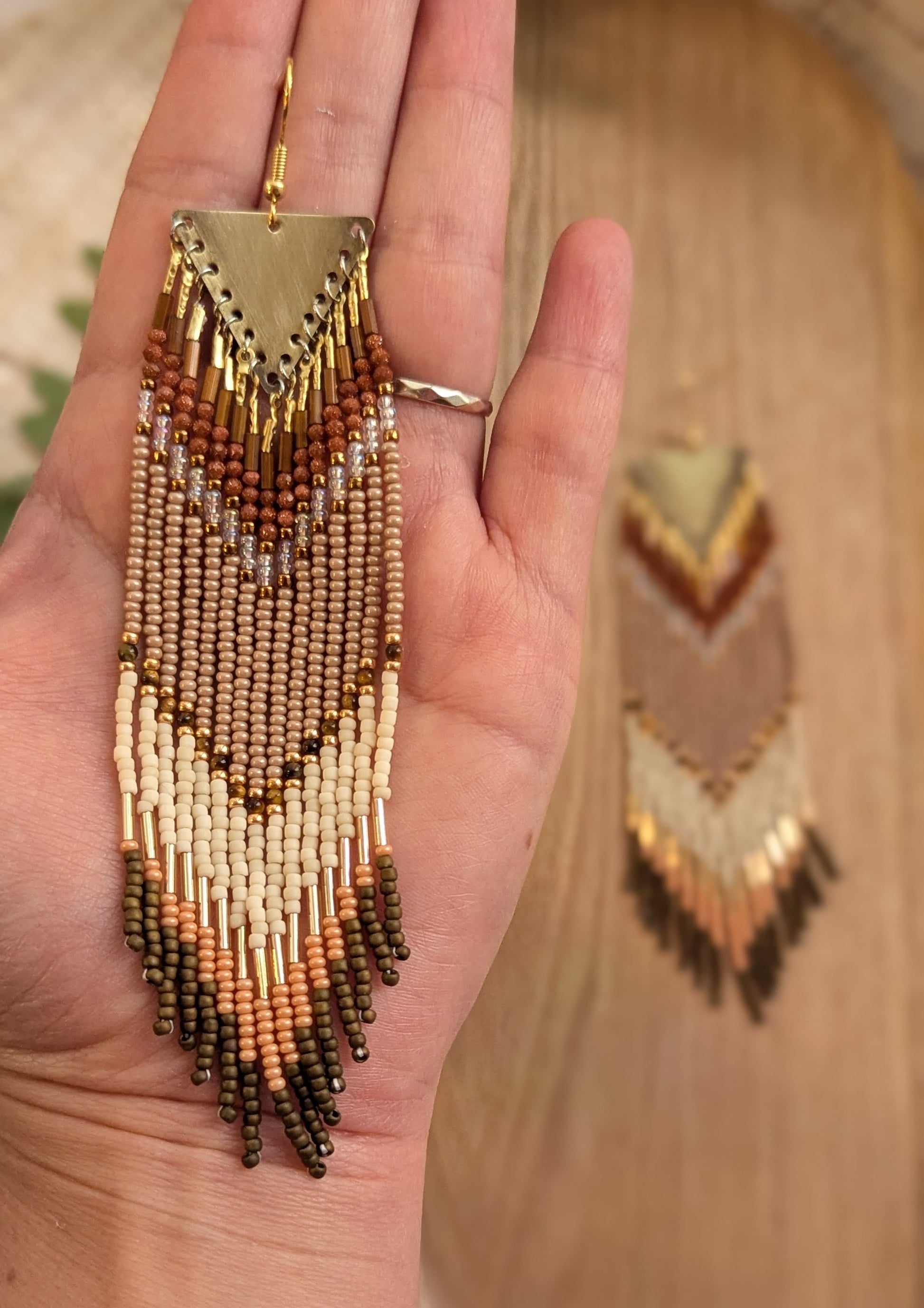 Crafted with soft earth tones and brass finishes, these long native beaded earrings combine neutral elegance with a bit of edge. Featuring a mix of terracotta, sand, bone, and gold beads, they bring warmth and structure to any look. Made by hand using traditional and modern beadwork techniques, they’re a statement piece rooted in wearable art