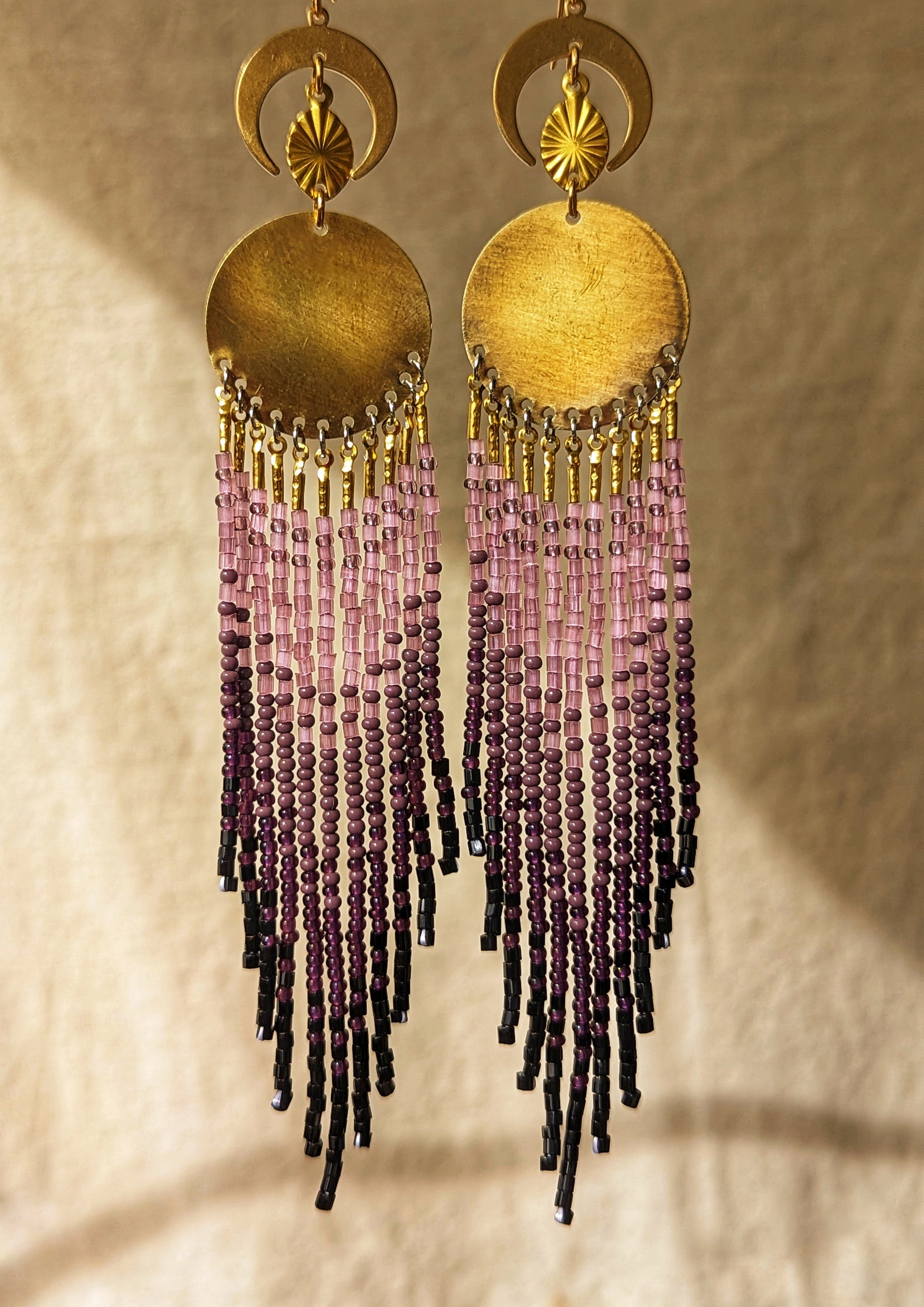 The gradient of purples in these handcrafted beaded earrings mimics the hues of a twilight sky, transitioning from deep, bewitching dark purples to ethereal lavender shades. The ombre effect evokes a sense of enchantment, akin to the gradual shift of colors during twilight, reflecting the enigmatic allure of the night.