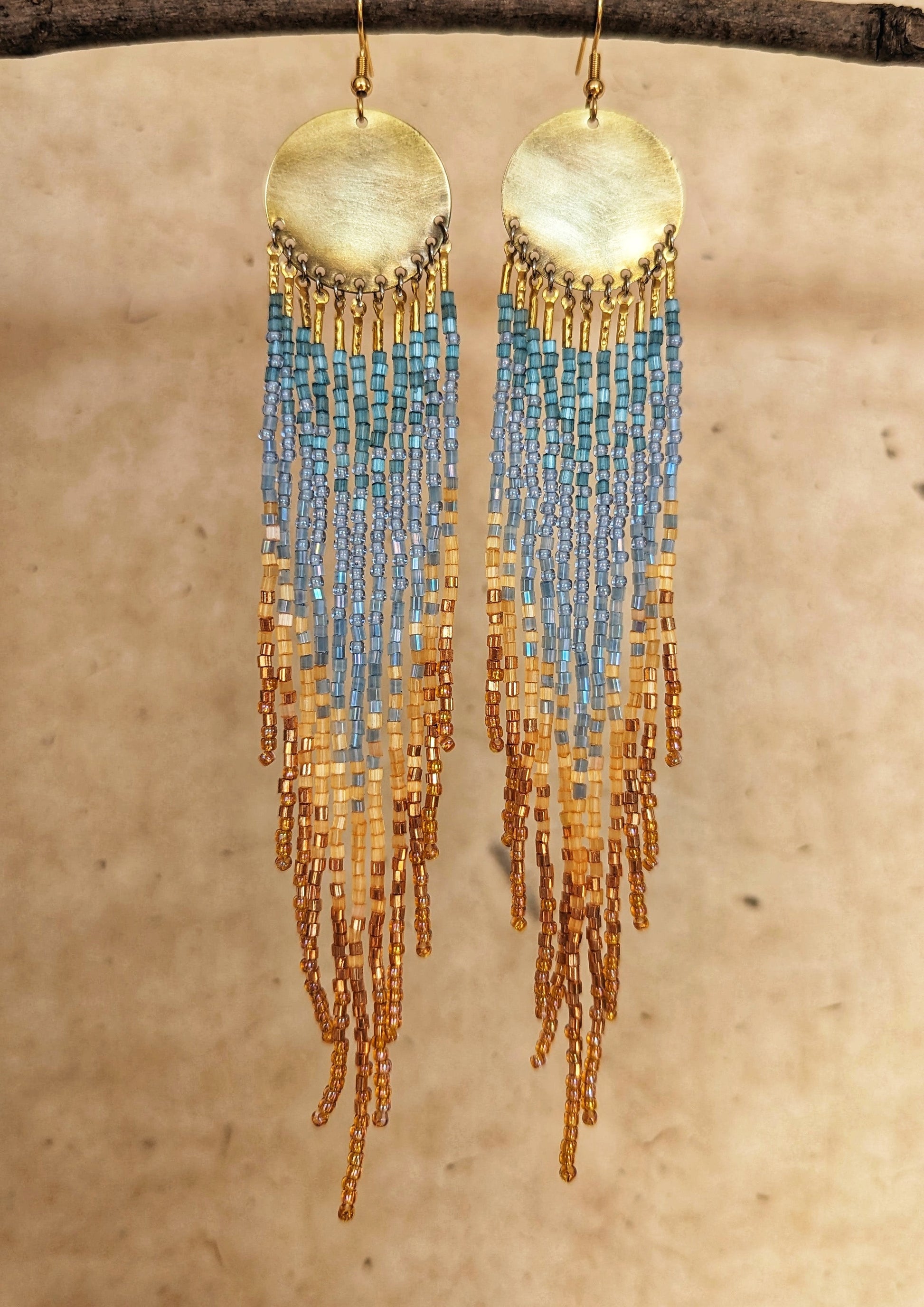 - Handmade iridescent seed bead earrings created with antique-finish brass, sterling silver ear wires, glass beads, and high-quality Japanese nylon thread.