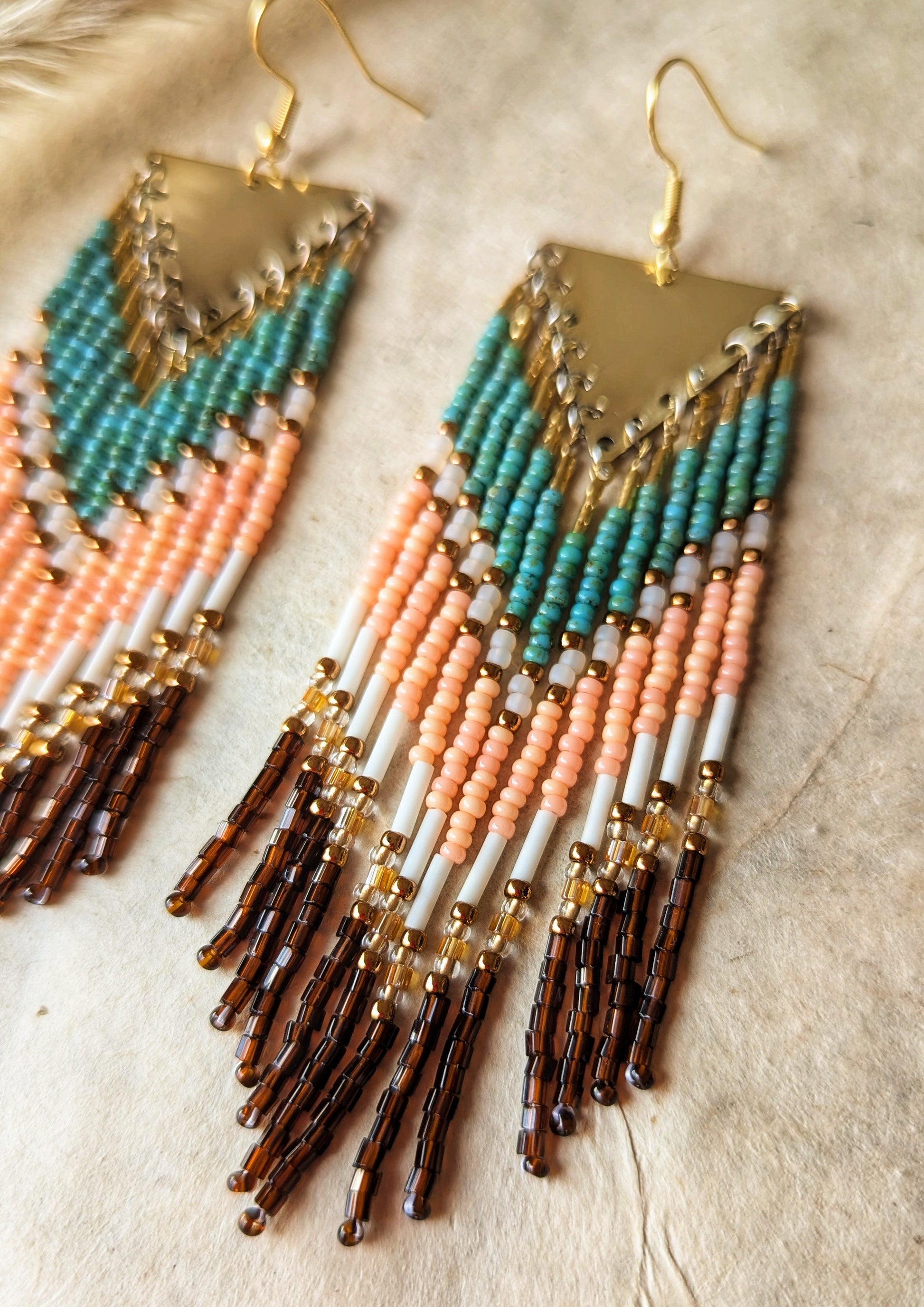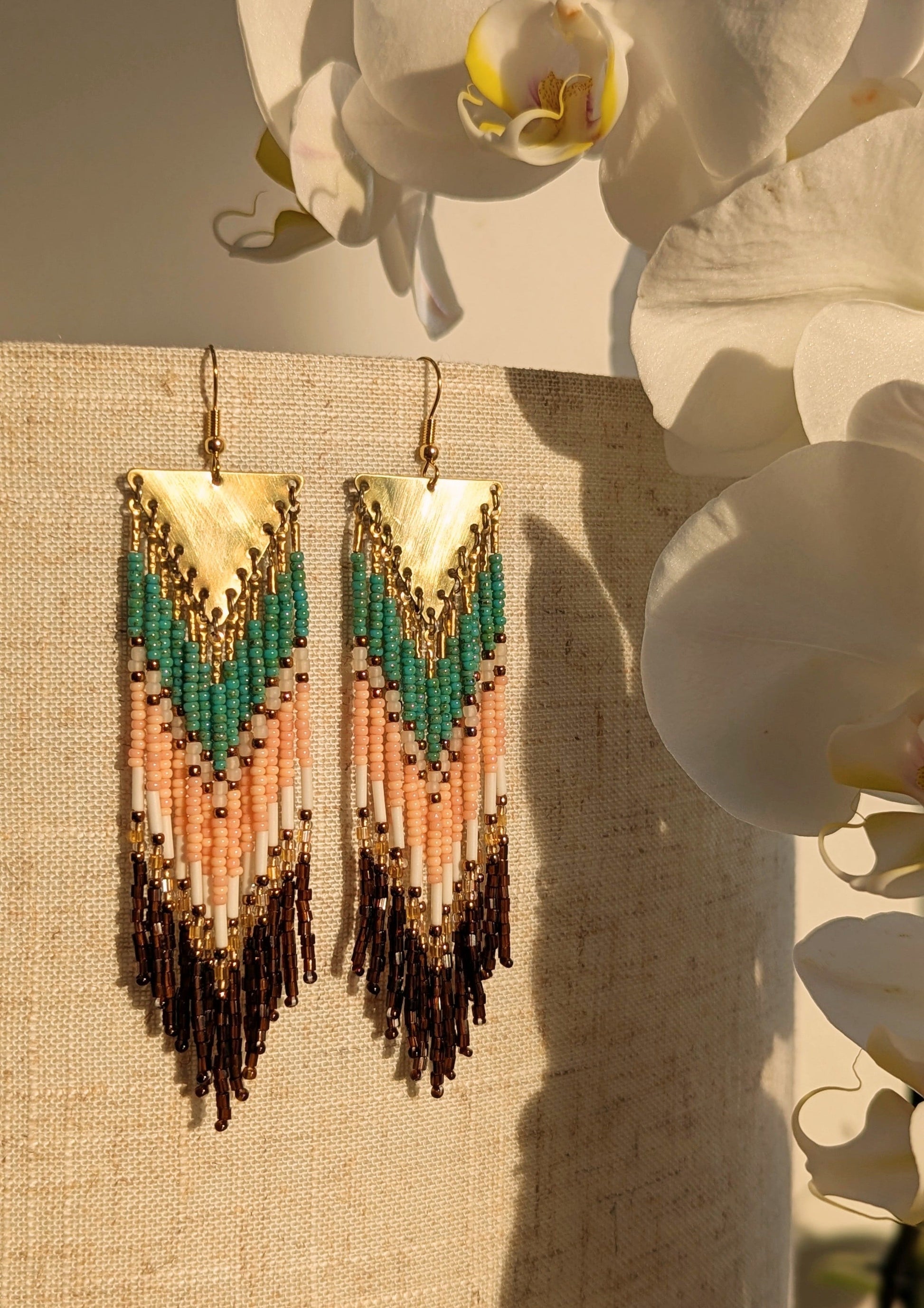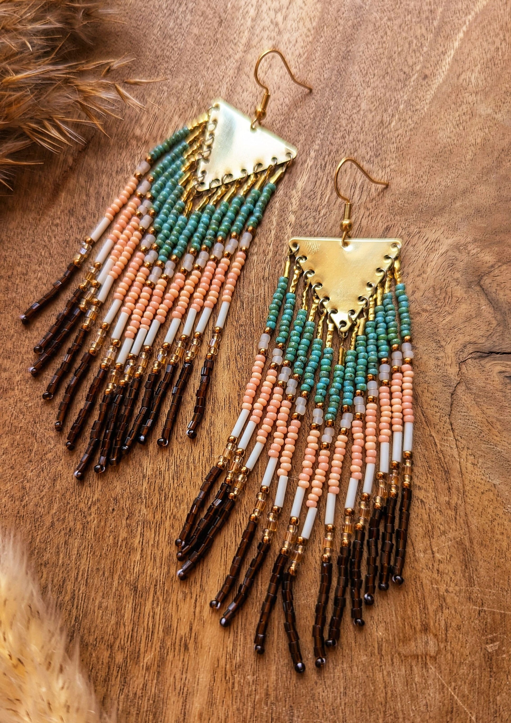 - Handmade seed bead earrings created with antique-finish brass, hex-cut glass beads, and high-quality Japanese nylon thread.
