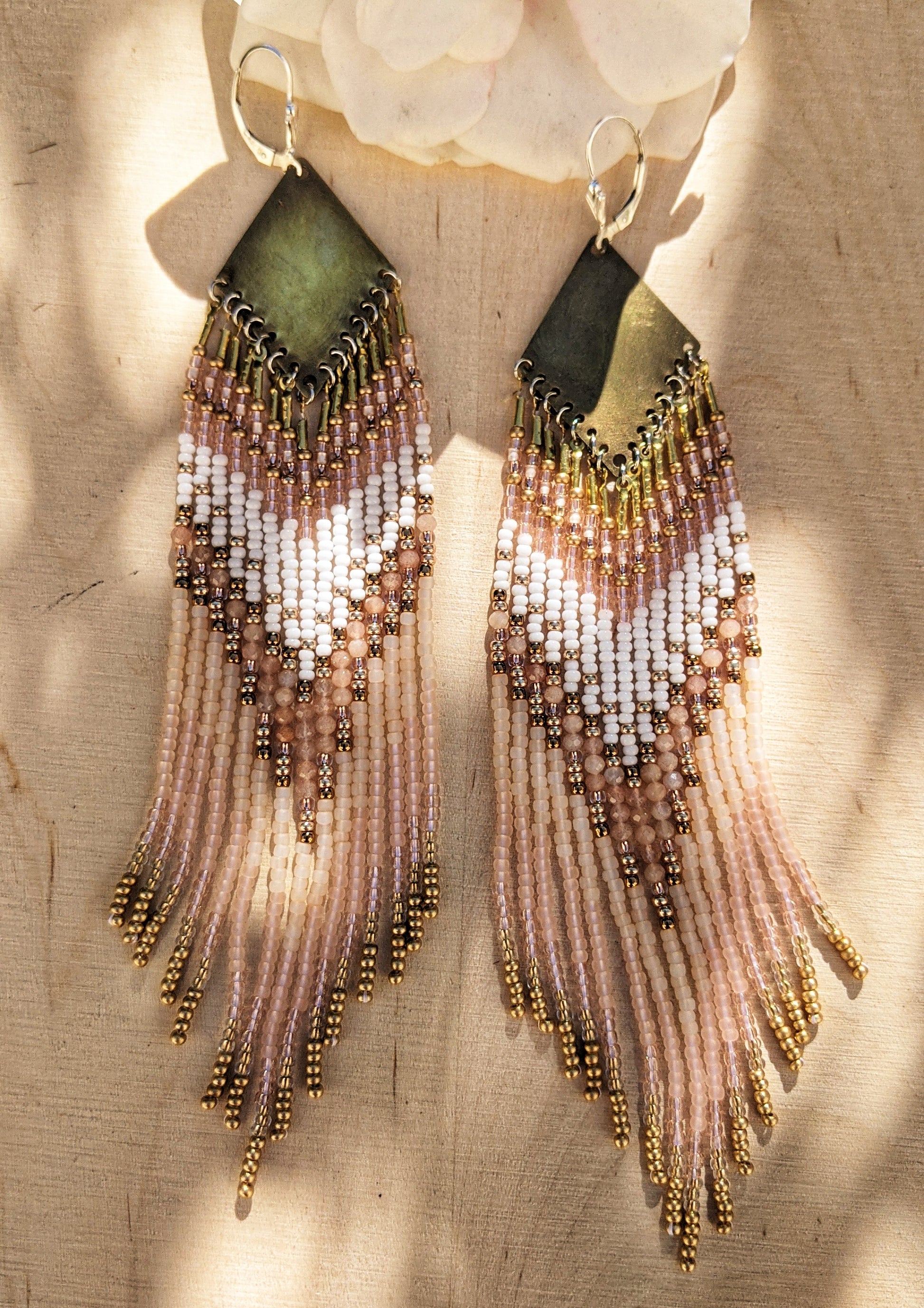 - Handmade beaded earrings created with antique-finish brass, glass beads, natural stones, and high- quality Japanese nylon thread for ultimate durability.