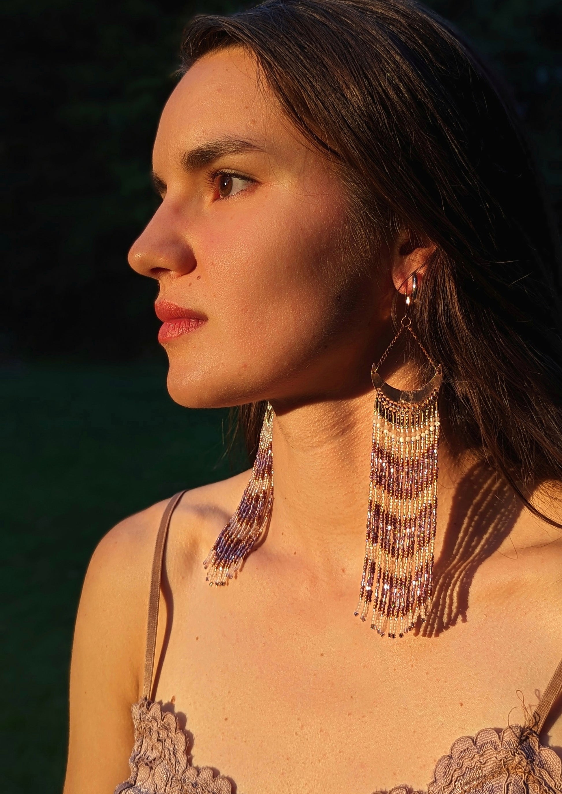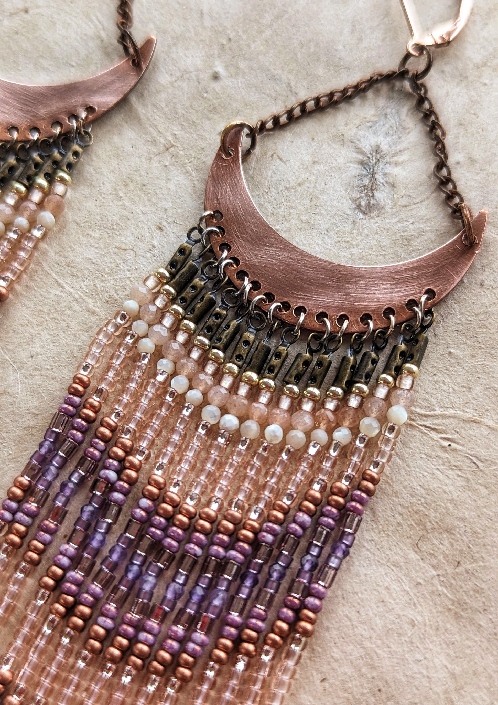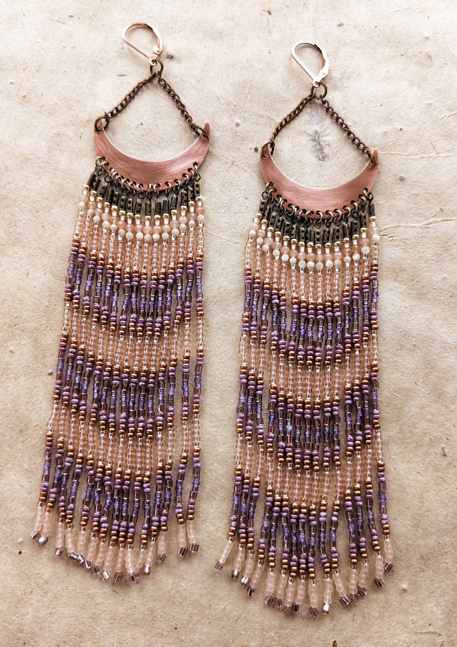 - Handmade beaded earrings created with semi-precious stones, glass beads, and copper.