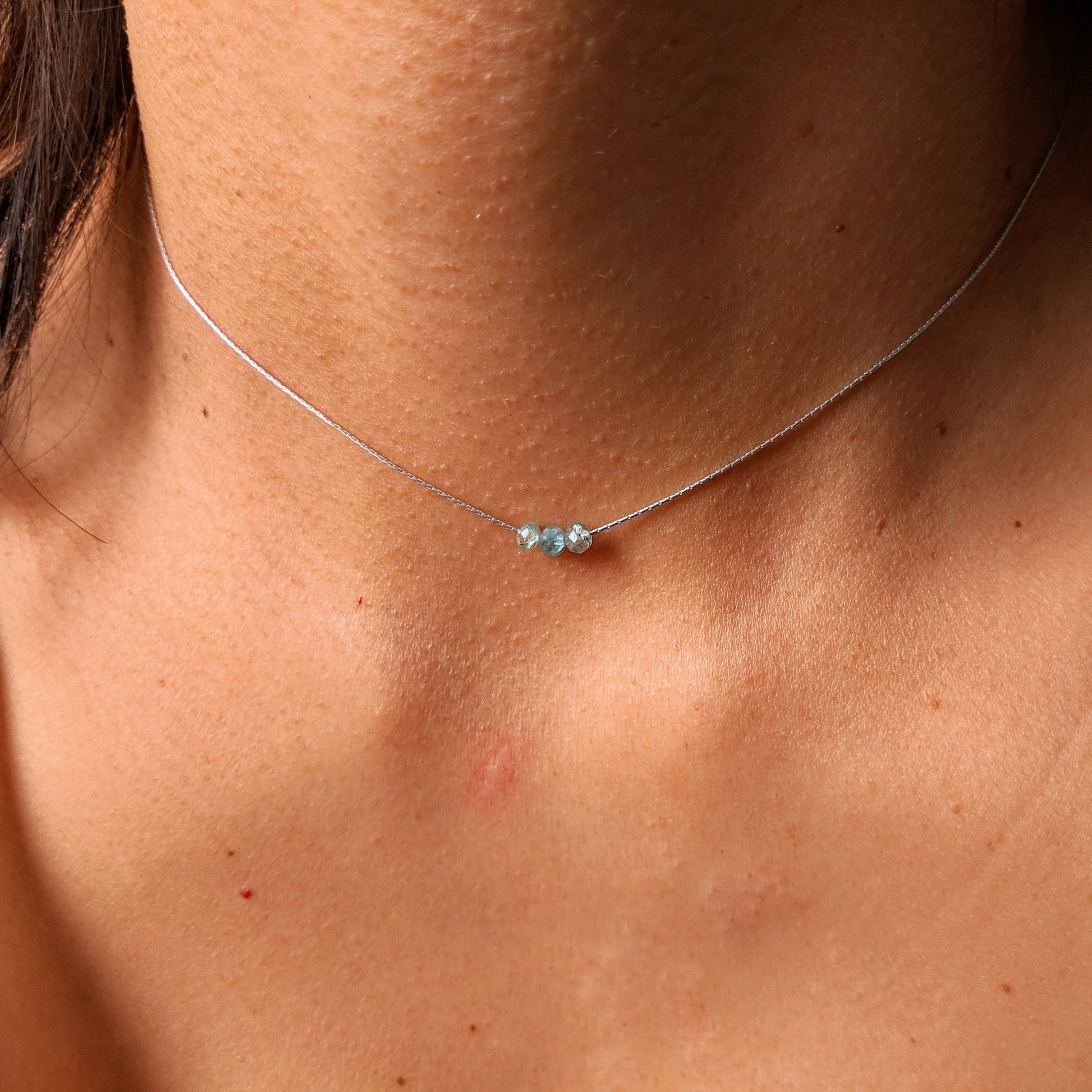 - Handmade sterling silver dainty necklace with three tiny aqua apatite gemstones