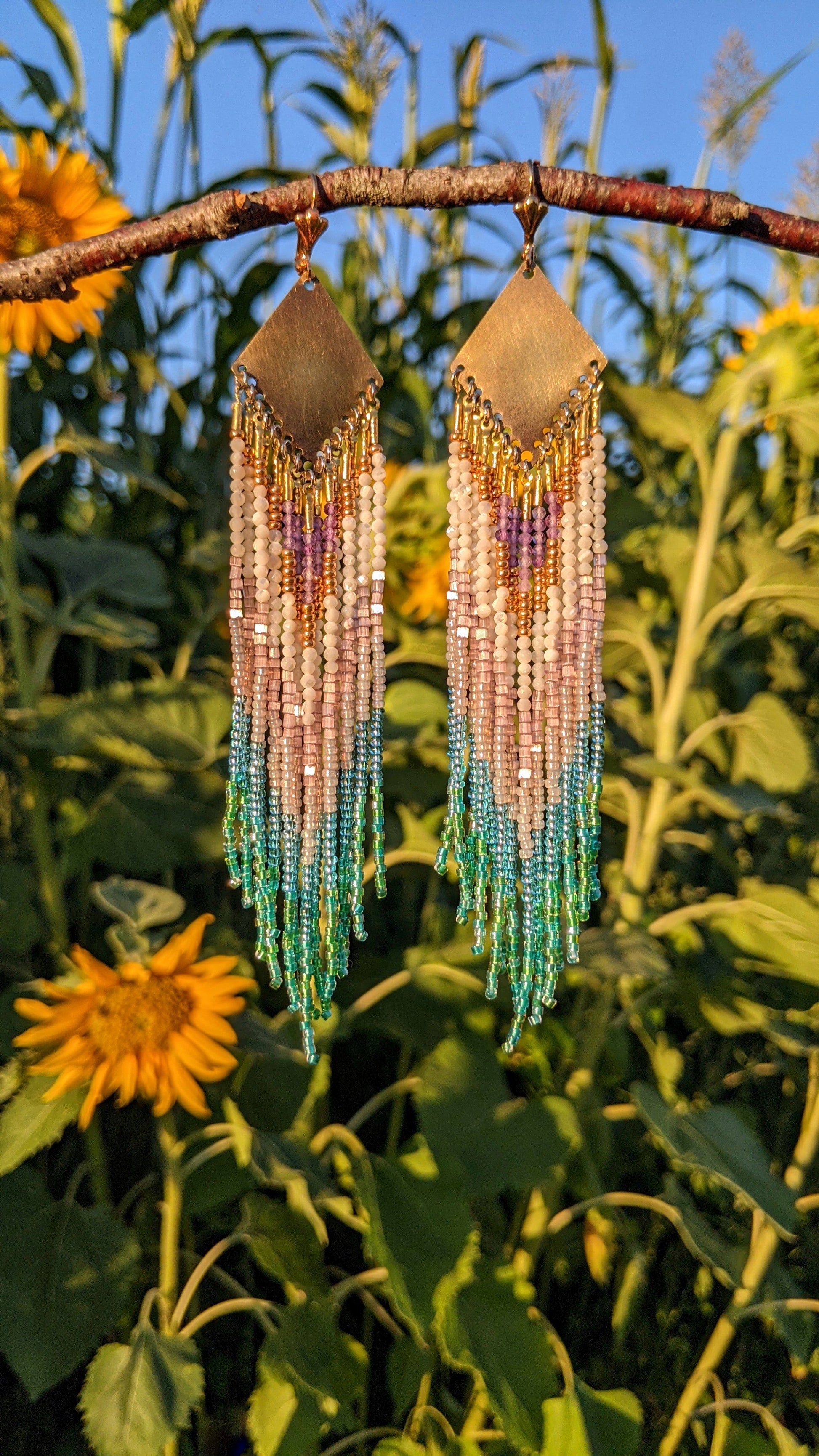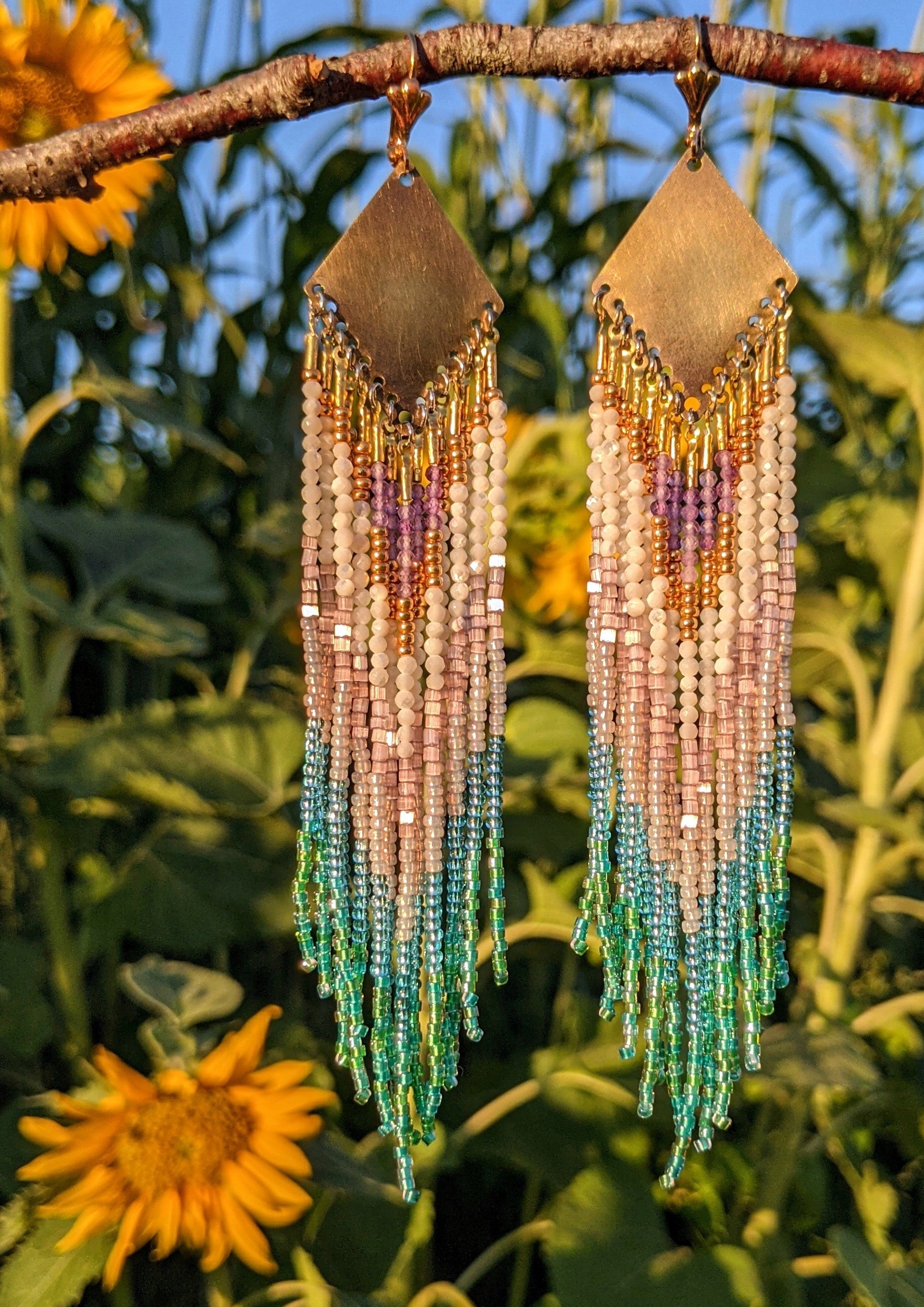 - Handmade seed bead earrings created with antique-finish brass, brass ear wires, glass beads, amethyst natural stones, mother of pearl beads, and high-quality Japanese nylon thread.