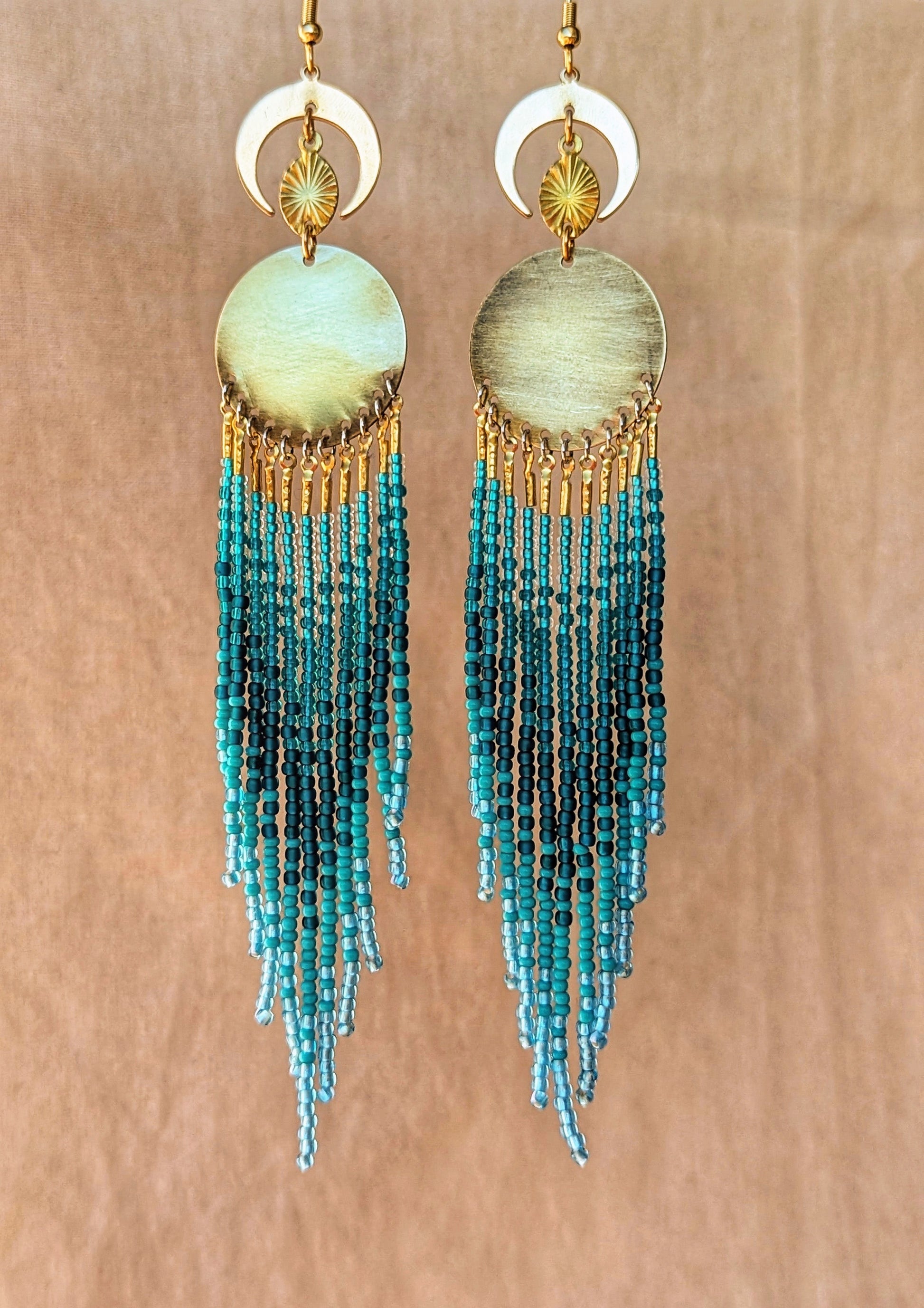 Featuring vibrant aqua turquoise beads that capture the essence of serene waters and delicate beading that reflects the sunlight, these earrings are reminiscent of the gentle shimmer of Bacalar Beach. Lightweight and comfortable, whether you're longing for a piece of Bacalar's peaceful ambiance or seeking a unique, handcrafted accessory, this crescent moon pair is a breathtaking choice.
