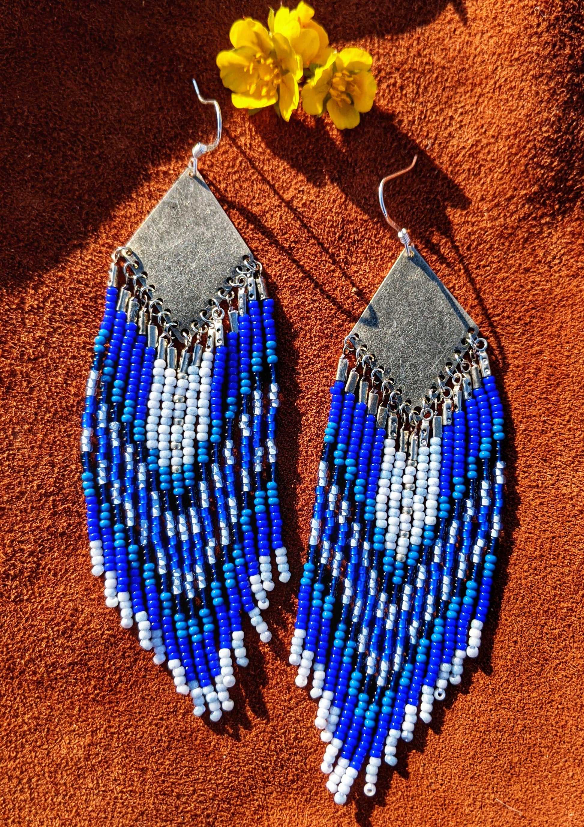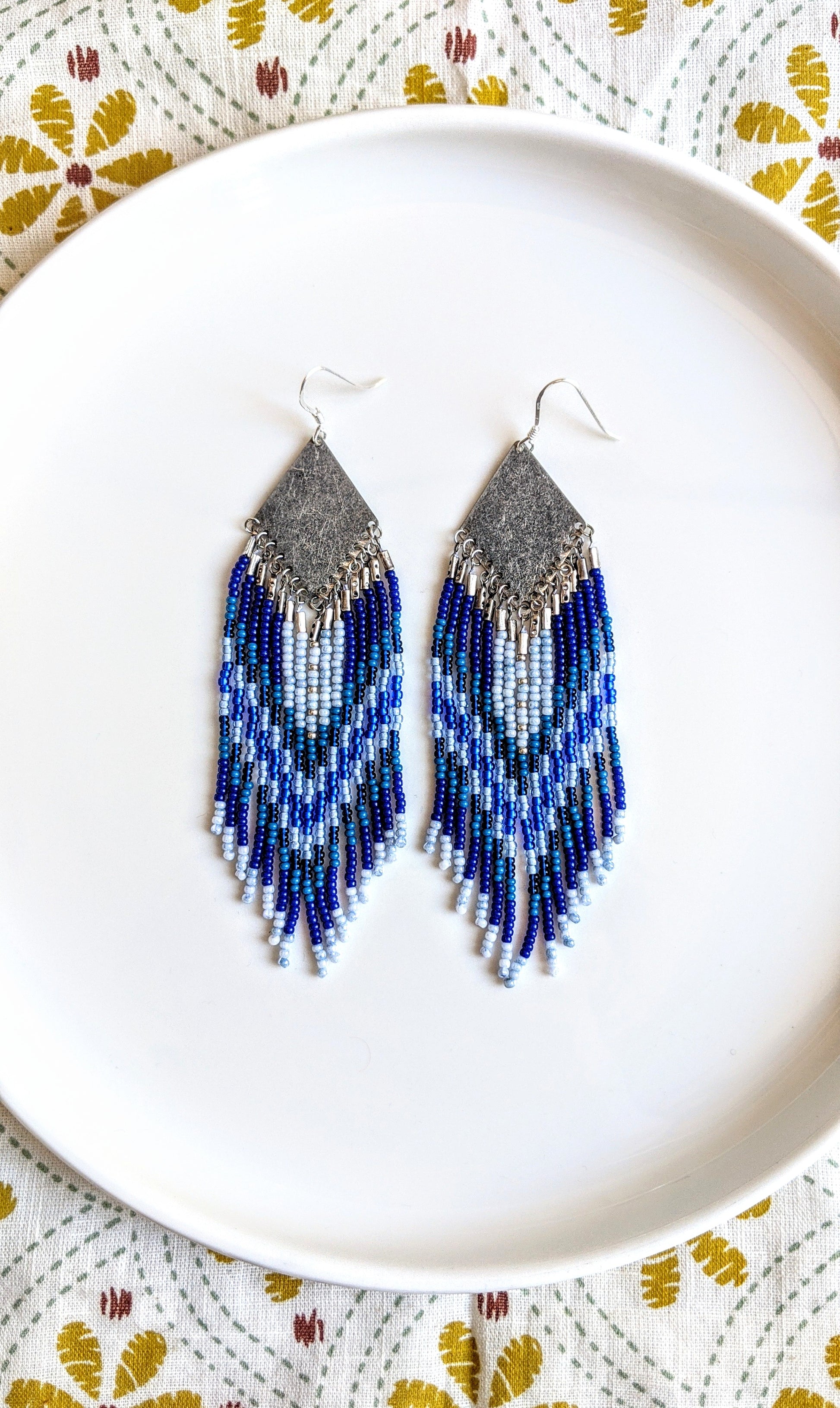 - Handmade blue seed beaded earrings created with brass, sterling silver ear wires, and glass beads.