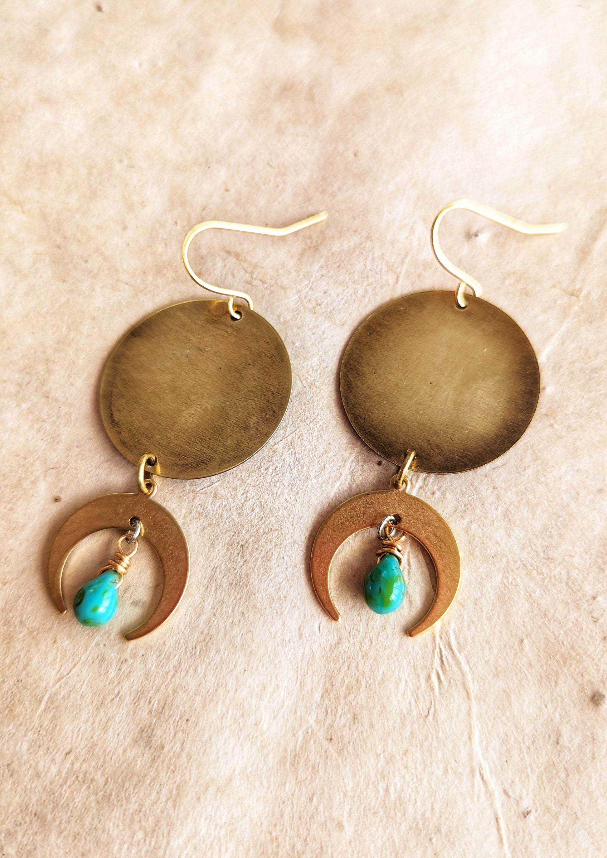 Introducing our Ophelia Turquoise Teardrop Moon Earrings, now featuring wire-wrapped Czech glass turquoise teardrops. These stunning earrings blend artisanal craftsmanship with vibrant, earthy tones, creating a perfect harmony of rustic and refined aesthetics. The brass crescents offer a unique texture that beautifully contrasts with the smooth, luminous turquoise teardrops. Each earring is a testament to the artistry and care that goes into its creation, making them a distinctive accessory that adds a touch of bohemian sophistication to any outfit.