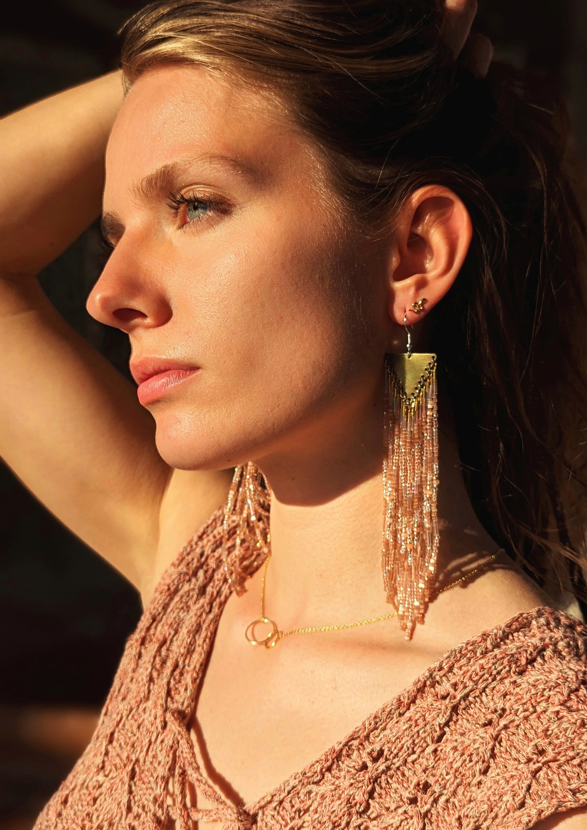 Take your style to the next level with our gorgeous Kate Beaded Earrings, featuring peach moonstone, satin Czech beads, and iridescent bugles. These earrings offer a flirty boho chic look, blending the soft, warm hues of peach moonstone with the elegant shimmer of satin Czech beads and the magical glow of iridescent bugles. Each earring is carefully handcrafted, ensuring high-quality and one-of-a-kind beadwork.