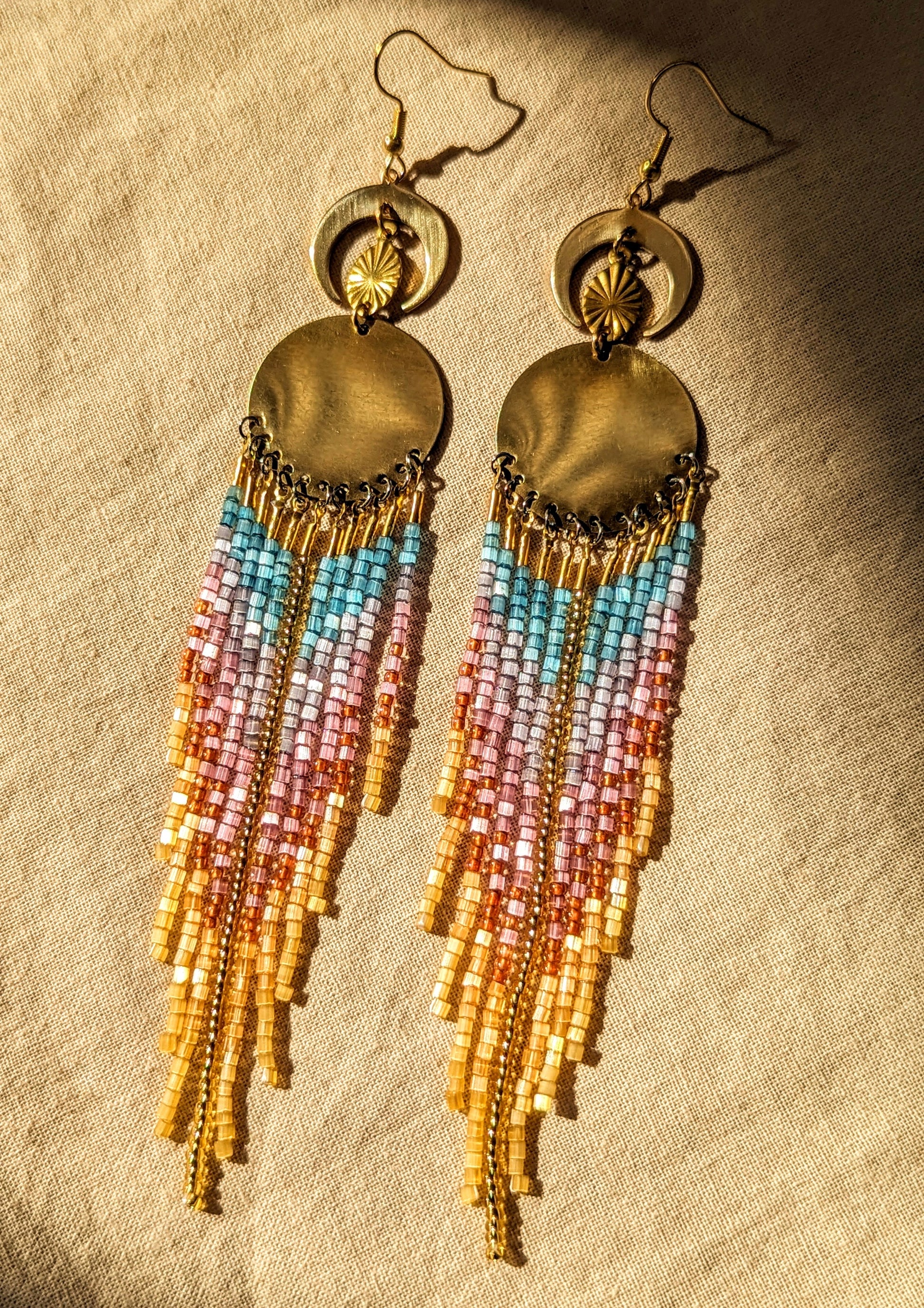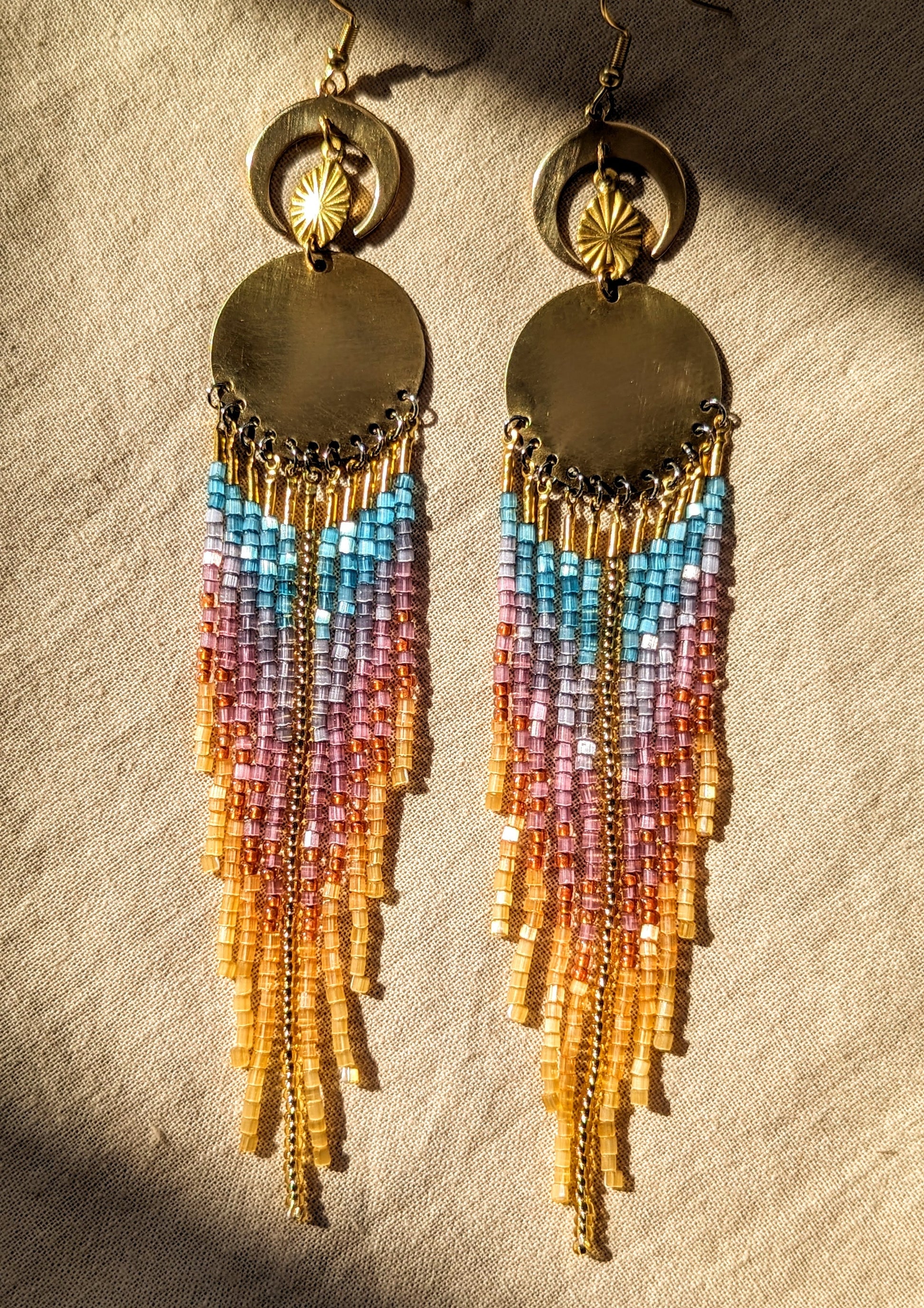 In the golden embrace of Mexico’s sun-drenched beaches, where the light dances upon the water's surface, the Rayos de Sol Beaded Earrings come to life. Handcrafted with iridescent hex-cut beads, each bead reflects the shifting hues of the ocean at dawn. Golden brass moons rise like celestial bodies, casting their soft glow across the landscape. These artisan earrings, much like the sun's rays, are a radiant homage to Mexico's nature's brilliance. A true piece of wearable art, capturing the essence of Mexico's serene beaches in every delicate bead.