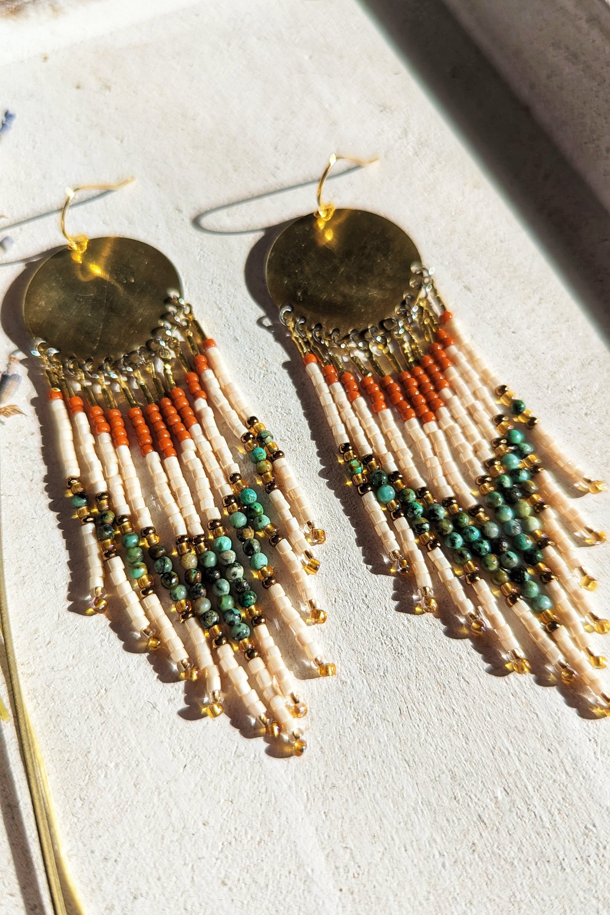 These boho beaded earrings carry a warm pulse of earth and fire. With ivory seed beads, burnt clay tones, and turquoise stones falling from brass suns, they echo sacred rhythm and grounded joy. Each pair is a handcrafted story, stitched with reverence and made for the ones who walk with rooted grace and wild spirit.