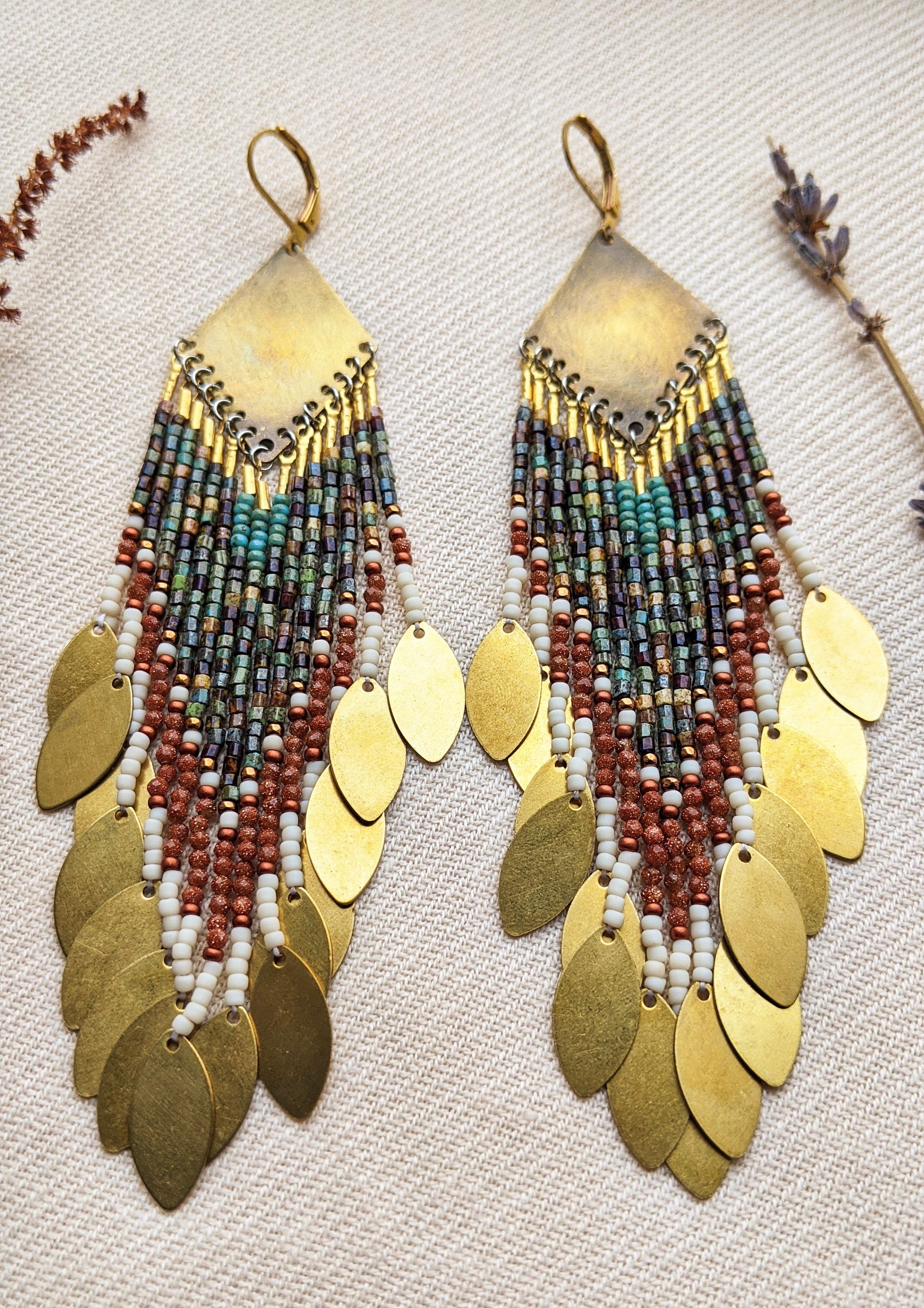 - Handmade beaded earrings with antique-finish brass, glass beads, and Japanese nylon thread for ultimate durability.