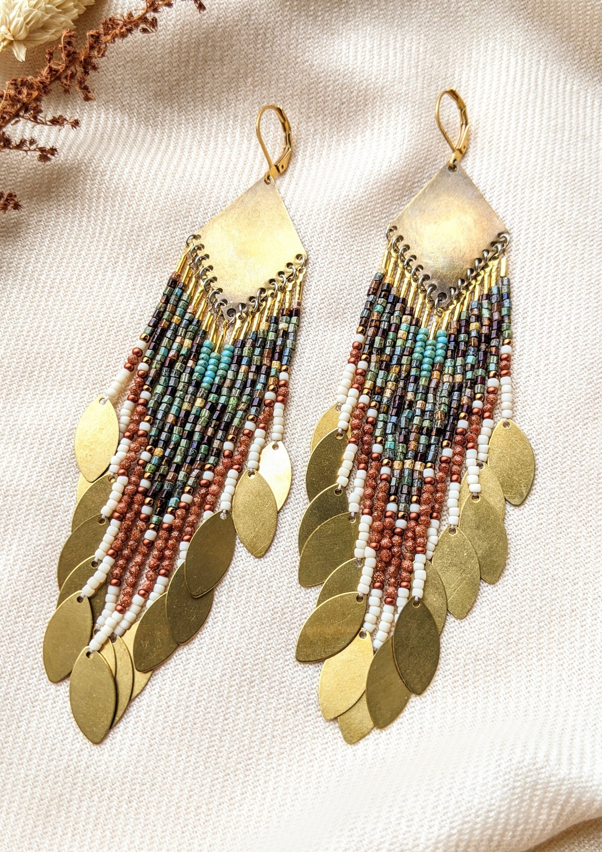 Light moves through these artisanal earrings like breath against warm skin. The beads shift from turquoise to rust to gold, catching the eye with every turn. The brass plate above gleams like sunlit metal, anchoring the strands in a dynamic rhythm.