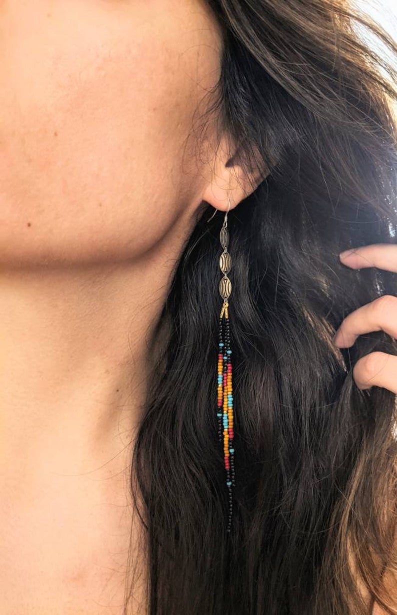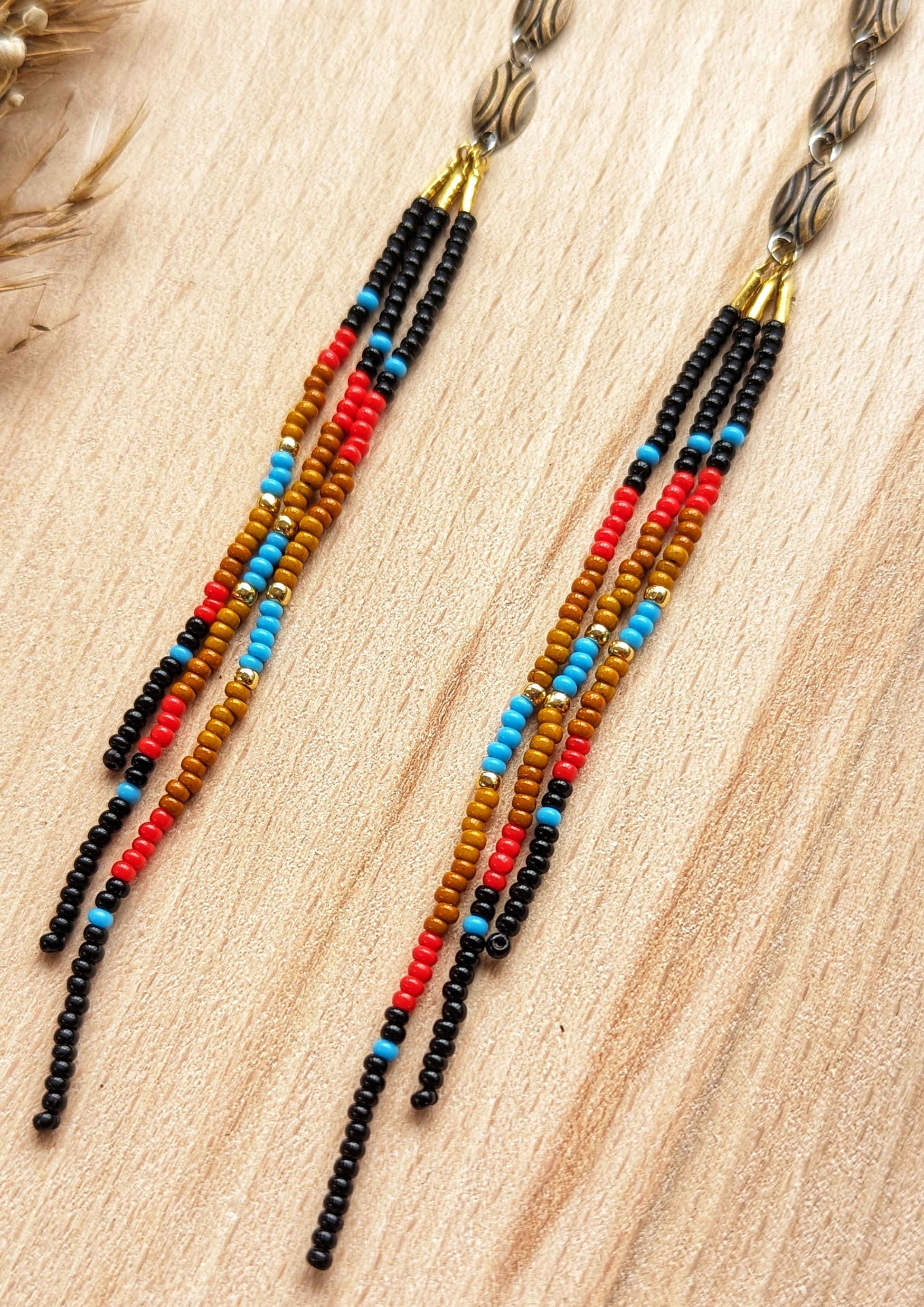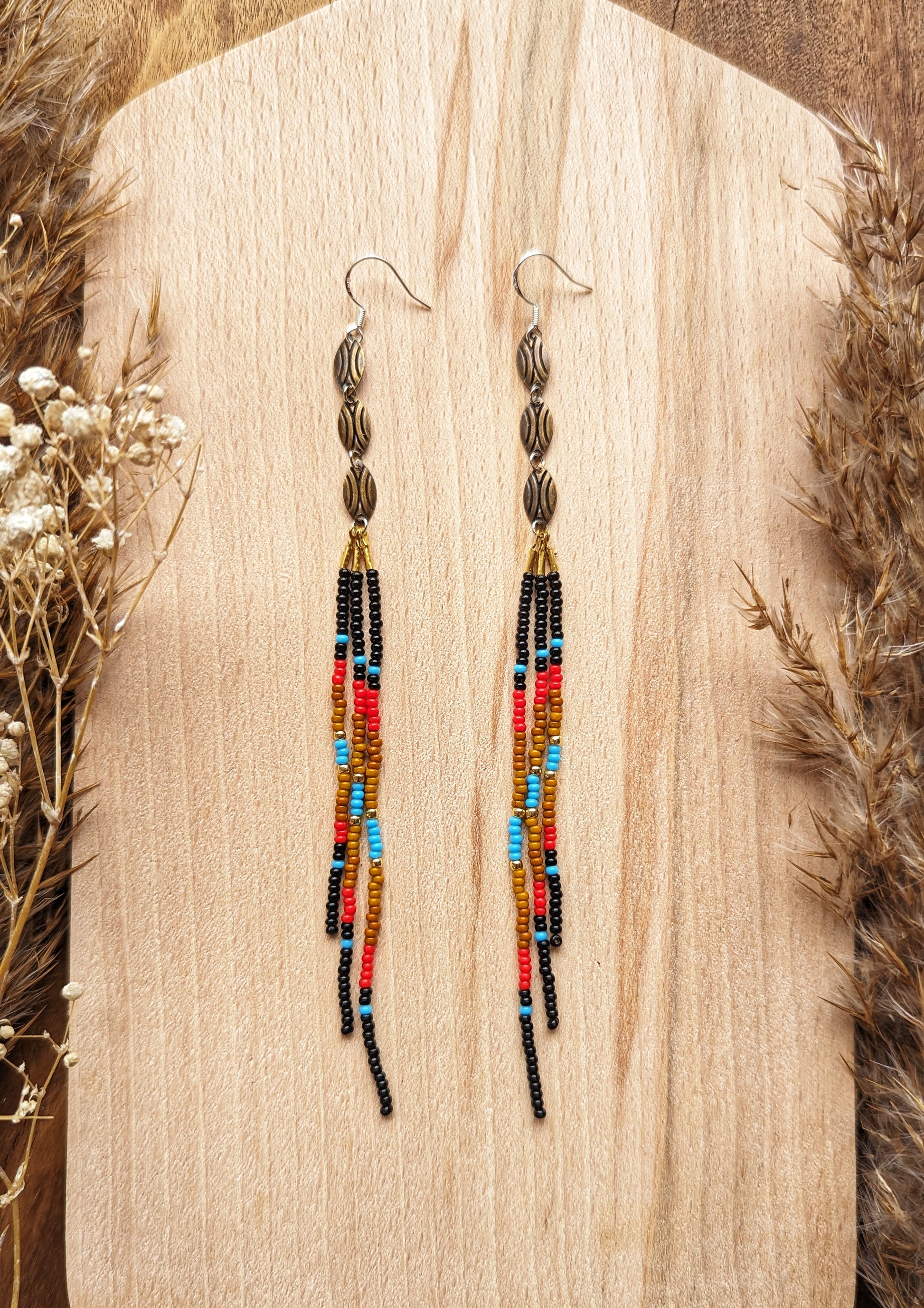 These seed bead earrings feature slender strands of beads in rich black, warm brown, vibrant red, and serene turquoise hues. The beads are carefully arranged to form a striking classic native palette that flows gracefully from the rustic metallic accents at the top. These earrings exude a sense of bohemian sophistication, making them a perfect accessory for those who are looking for something more than just earrings. Their unique design and bold colors bring a touch of artistry and cultural flair, showcasing a beautiful blend of traditional and contemporary styles.