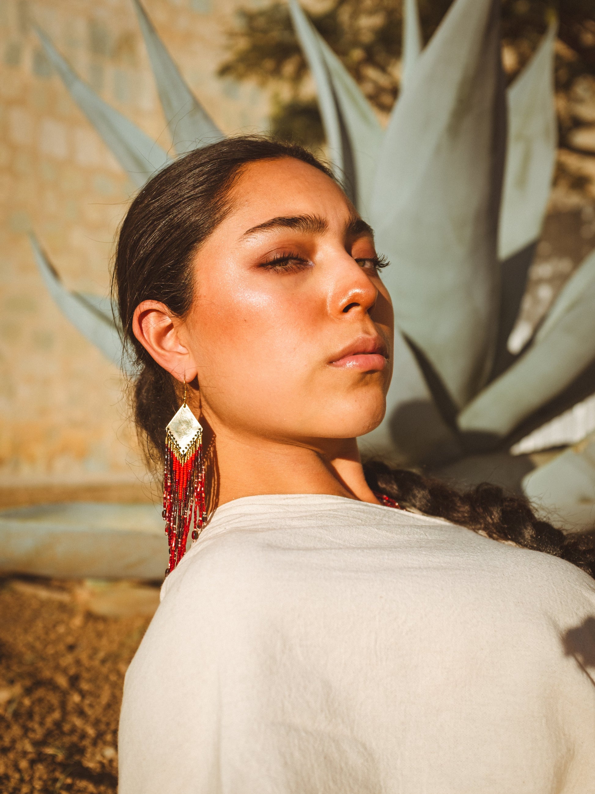 These handcrafted earrings are a tribute to the artisans who transformed color from the cactus plague. The brass detailing mirrors ancient craft, while the handwoven design thrives with life and tradition. A wearable offering to Mexico’s ingenuity and the enduring beauty of creation.
