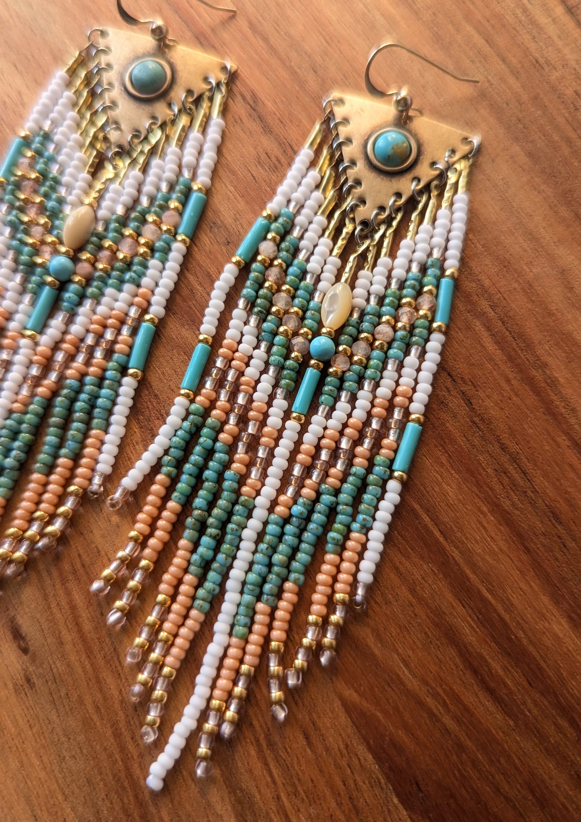 The Sierra Sunrise Turquoise Beaded Earrings capture the stillness of early morning in the mountains. Strands of white, peach, and green turquoise beadwork flow from warm brass, crowned with a Kingman turquoise that feels as timeless as the sky.