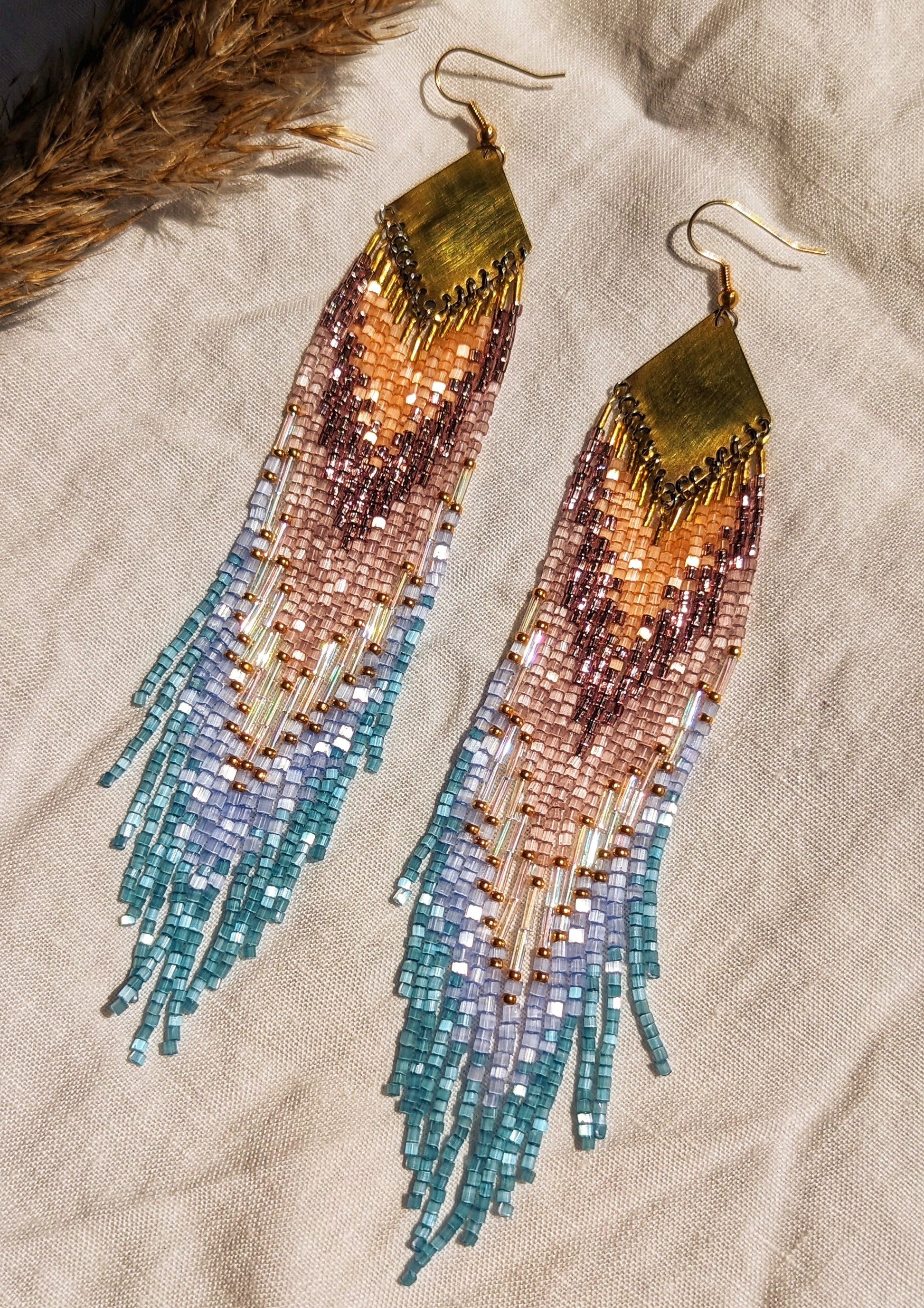 - Handmade seed bead earrings created with antique finish brass, sterling silver ear wires, satin glass beads, and high-quality Japanese nylon thread for ultimate durability.